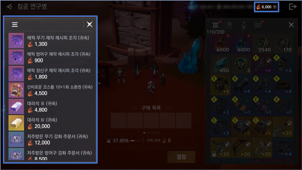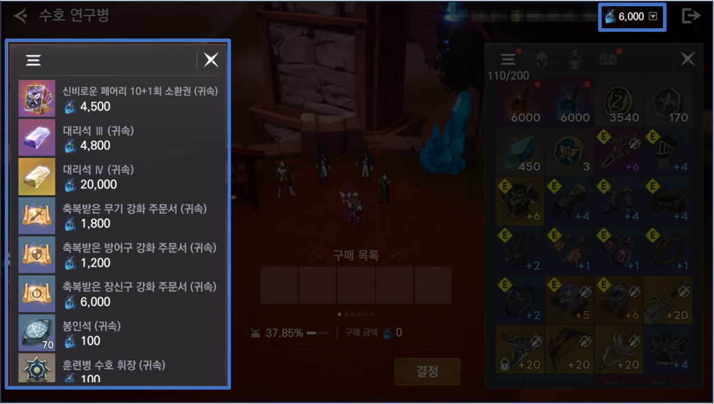 - 마을에 위치한 수호연구병 NPC에게 '수호의 정수' 를 지불하고 다양한 아이템을 구매할 수 있습니다.