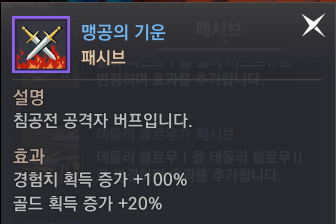 - 맹공의 기운 (서버 침공 유저) : 골드 획득 증가+20%, 경험치 획득 증가 +100%