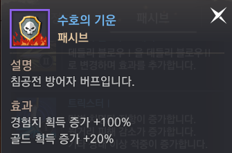 - 수호의 기운 (서버 방어 유저) : 골드 획득 증가+20%, 경험치 획득 증가 +100%