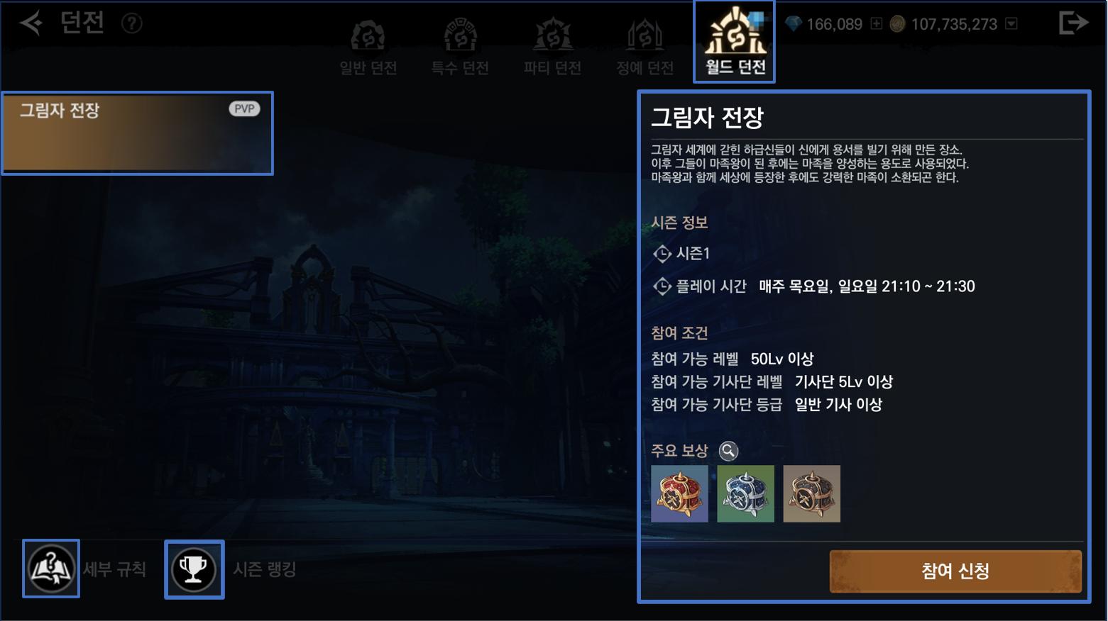 - 그림자 전장 참여 신청을 통해 입장할 수 있습니다.