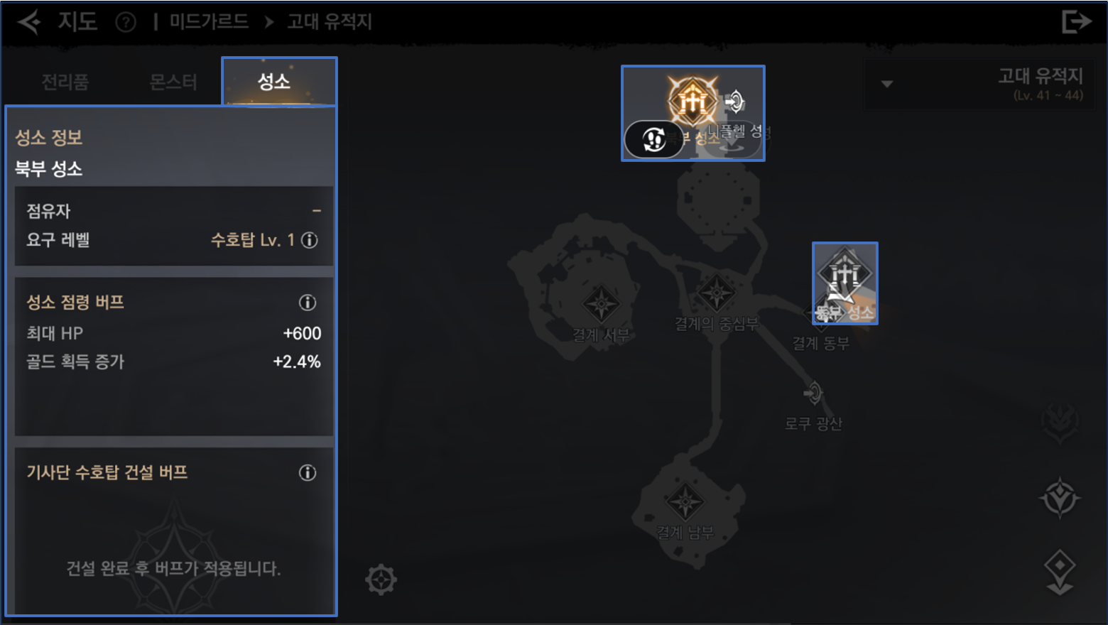 - 성소에 설치 가능한 수호탑 요구 레벨 이상만 설치할 수 있습니다.