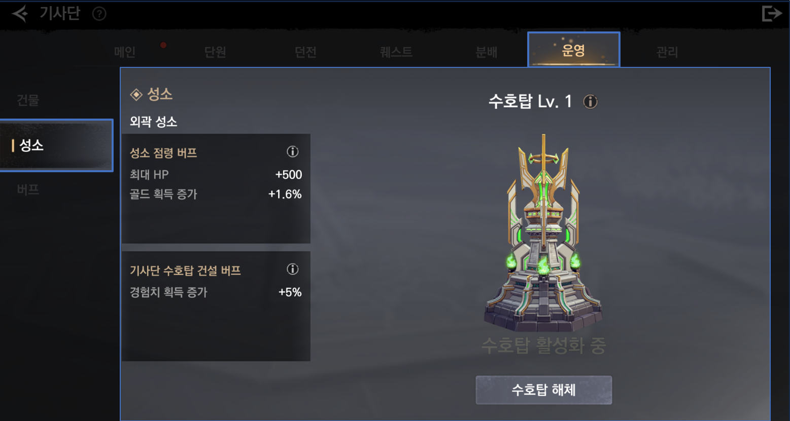 - 기사단 - '운영' 메뉴에서 점령 중인 성소 및 수호탑 관련 정보를 확인할 수 있습니다.