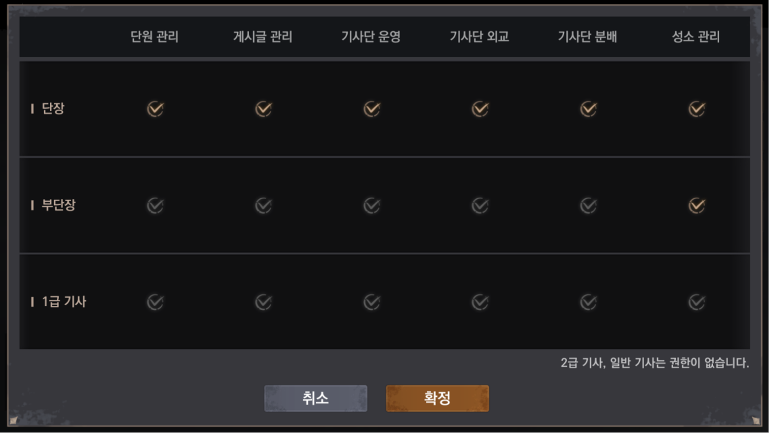 - 기사단 단장이 '기사단 권한' - '성소 관리'에서 권한을 부여할 수 있습니다.
