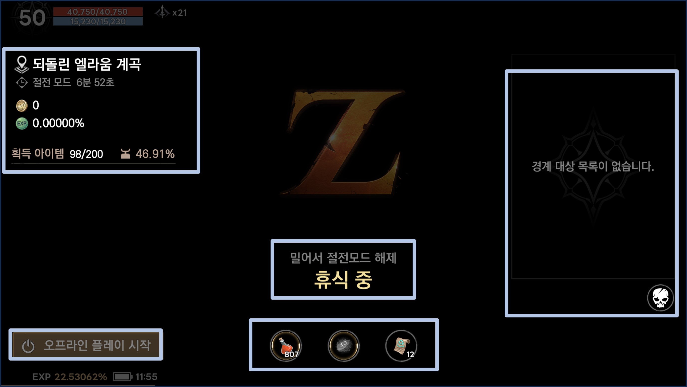 - 절전 모드 진행 시, 공격을 진행하고 있는 경우 "전투 중"이라고 표시되며, 이동 중인 경우에는 "휴식 중"이라고 표시됩니다.