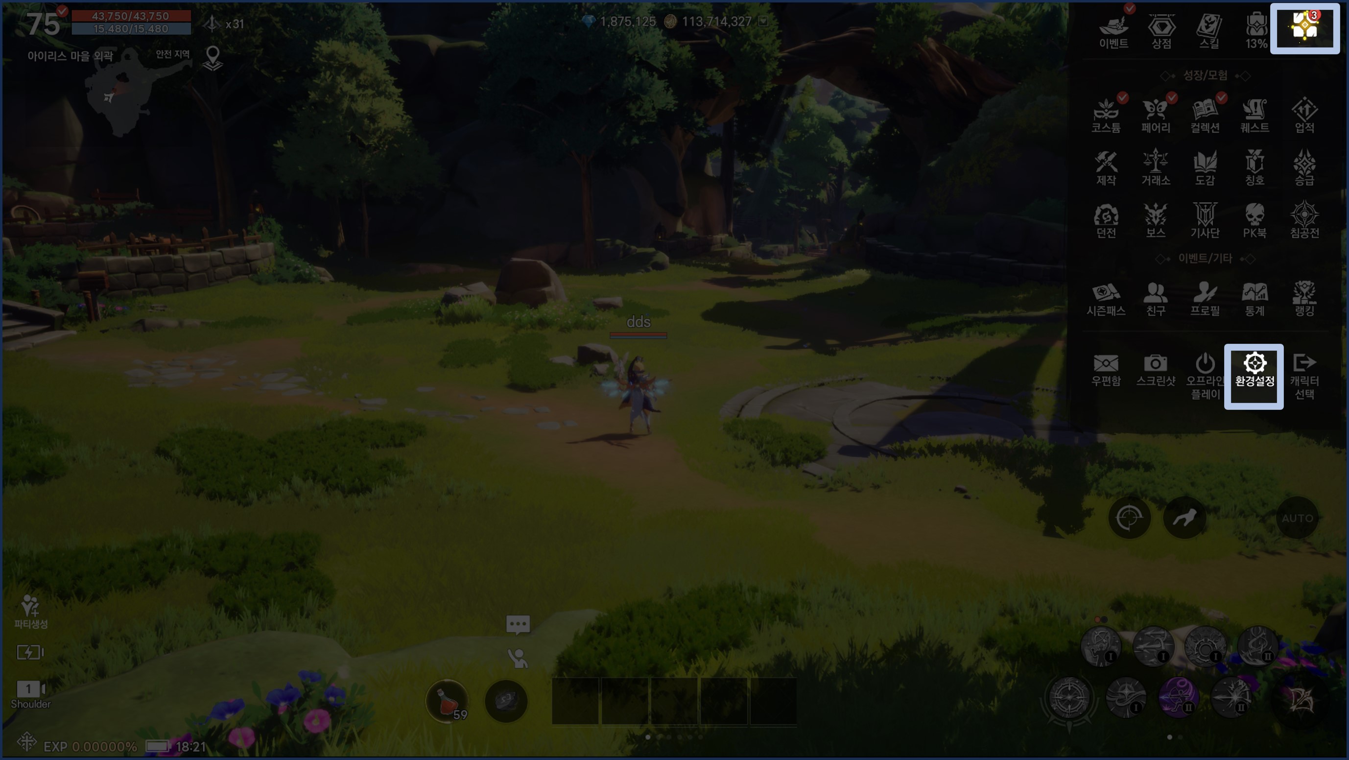 - 환경설정은 게임, 전투, 환경, 알림, 계정으로 구분됩니다.