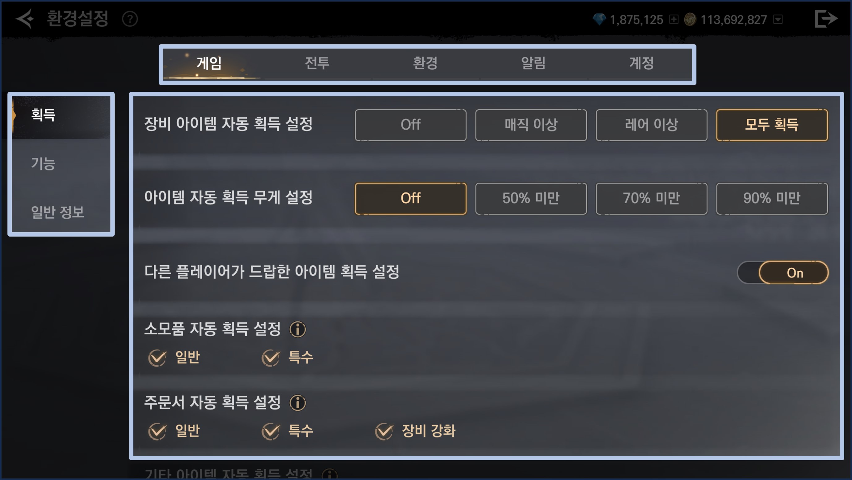 - 게임 탭에서는 획득, 게임 세부 기능, 출력 정보 등을 설정할 수 있습니다.