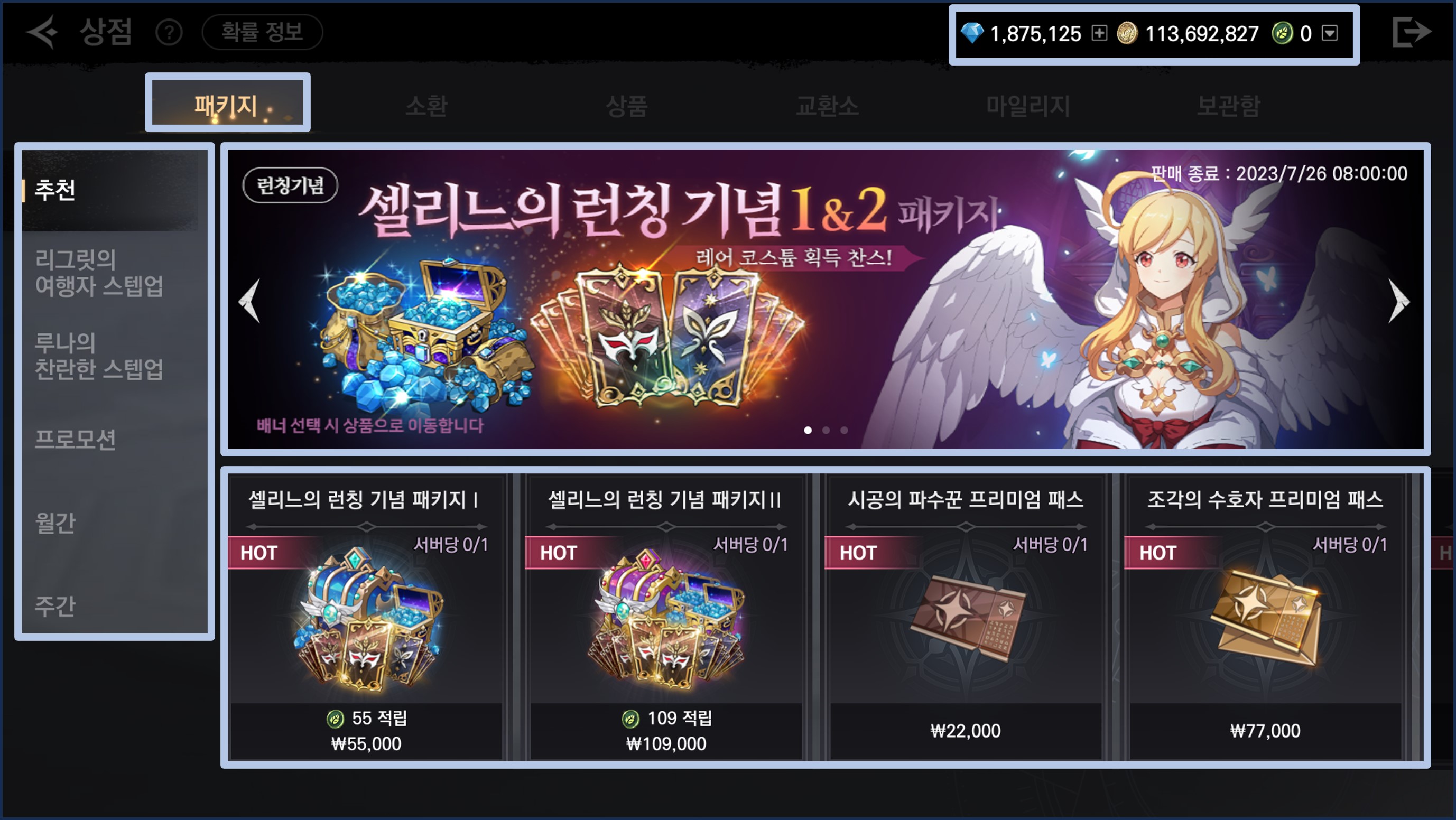 - 패키지 탭에서는 다양한 아이템을 하나로 묶은 패키지 상품을 구매할 수 있습니다.