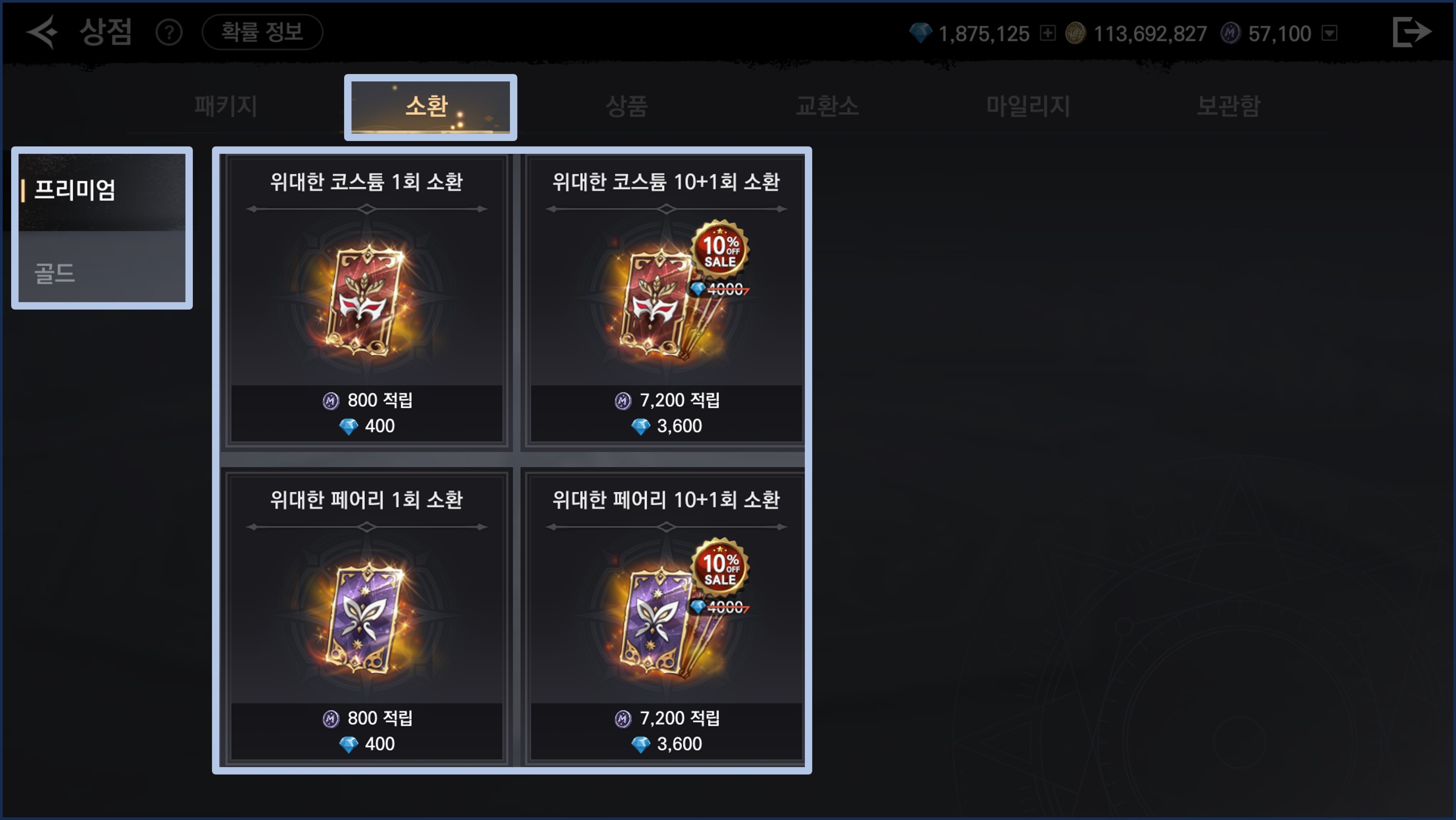 - 프리미엄 탭에서는 다이아로 소환할 수 있고, 골드 탭에서는 골드로 소환할 수 있습니다.