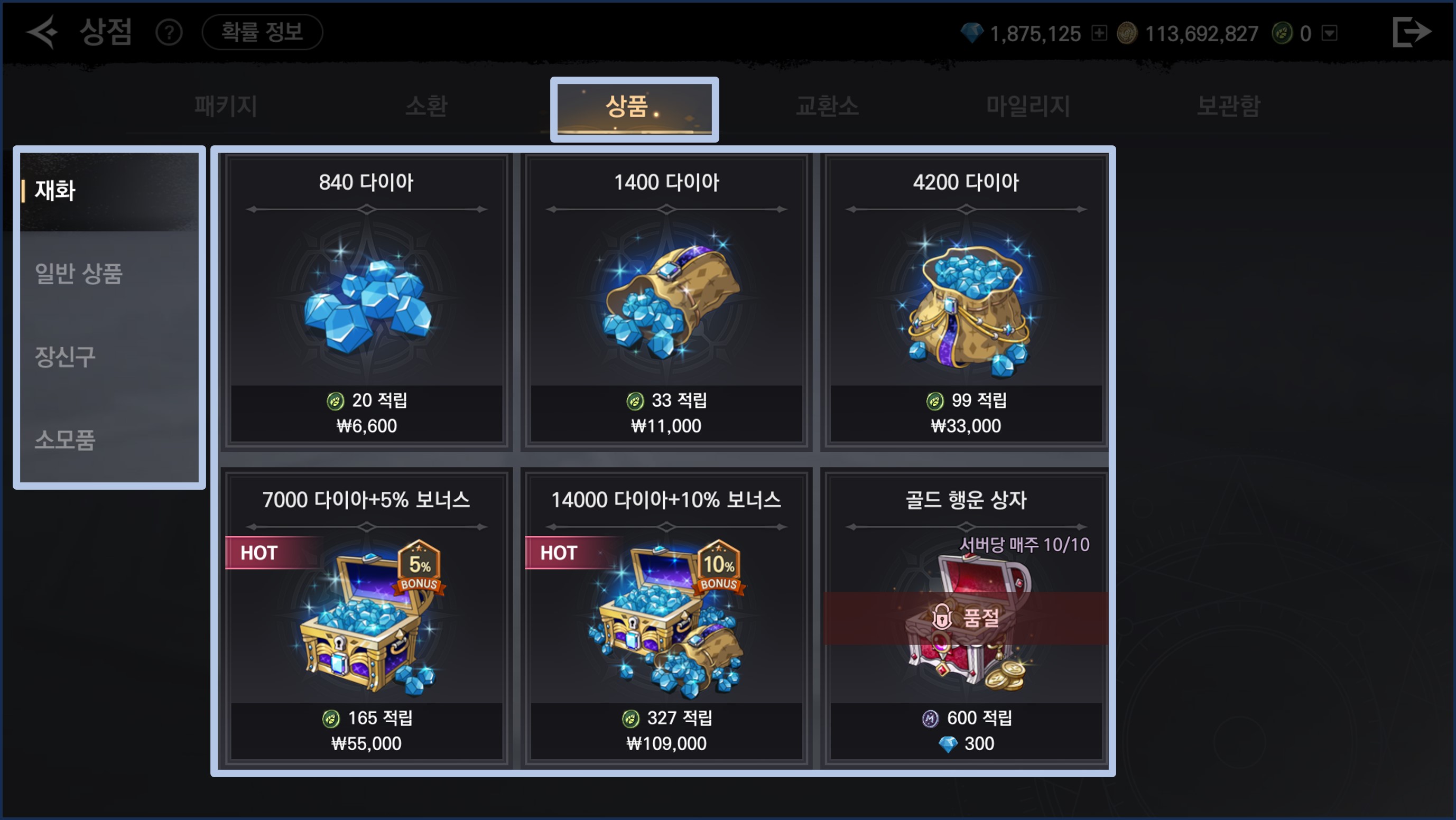 - 상품 탭에서는 게임 진행에 필요한 재화, 장비, 소모품을 구매할 수 있습니다.