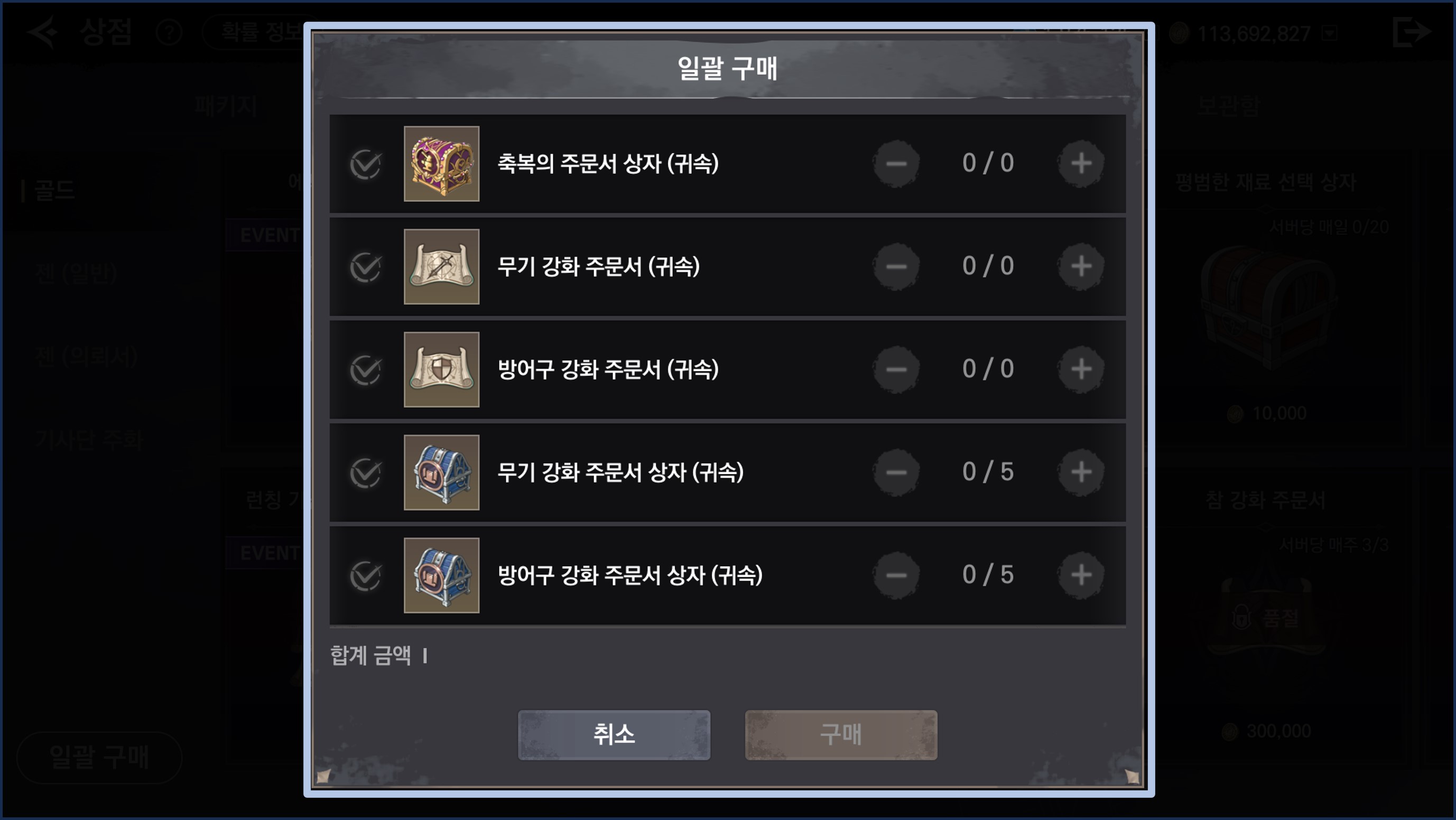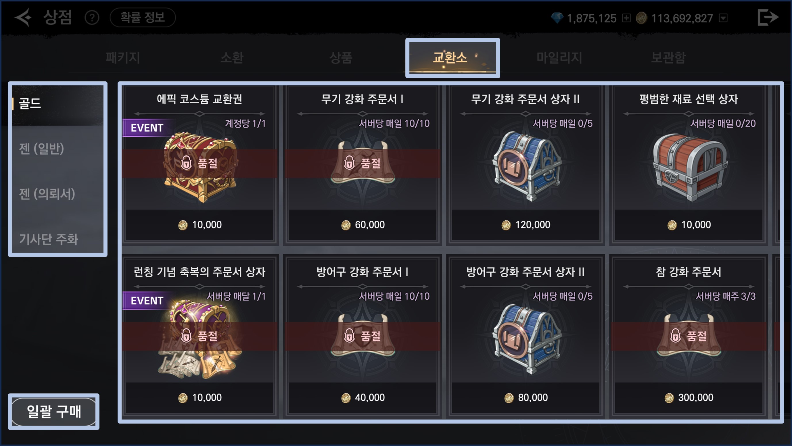 - 교환소 탭에서는 골드, 젠, 기사단 주화를 통해서 상품을 구매할 수 있습니다.