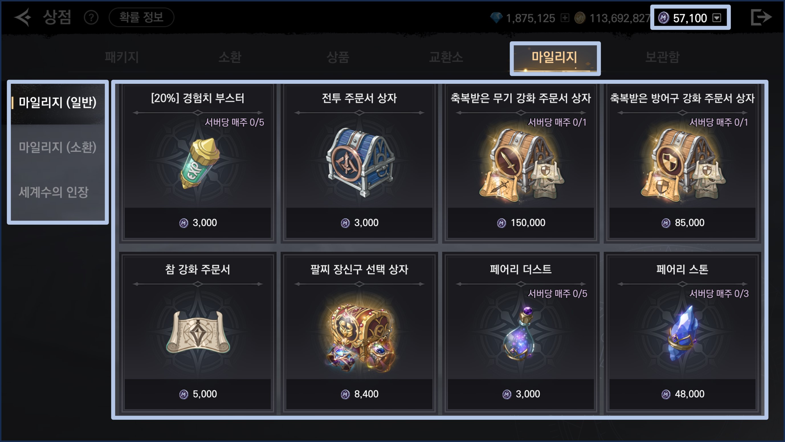 - 마일리지 탭에서는 마일리지와 세계수의 인장을 사용하여 상품을 구매할 수 있습니다.