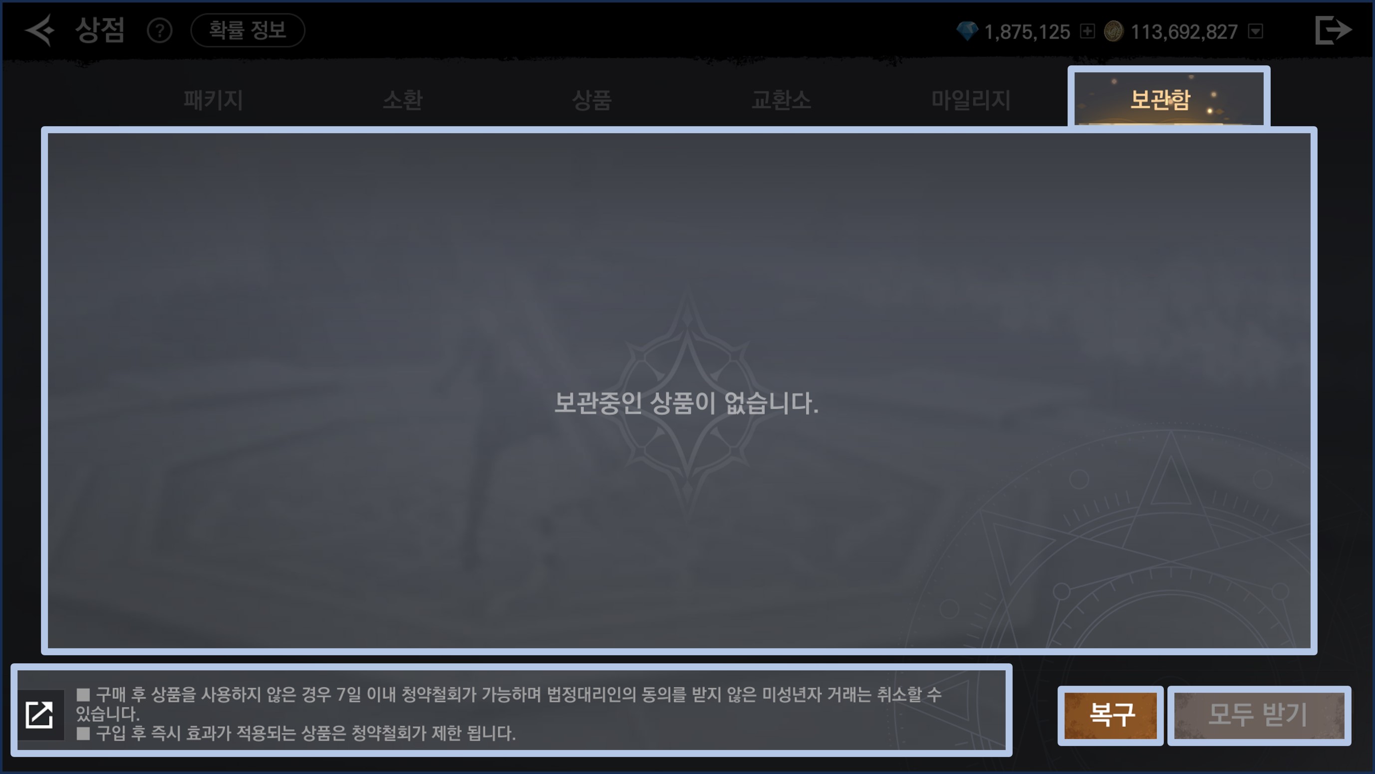 - 결제한 상품이 미지급되었을 경우 우측 하단의 '복구'를 누르면 상품이 지급됩니다. (모바일 환경)