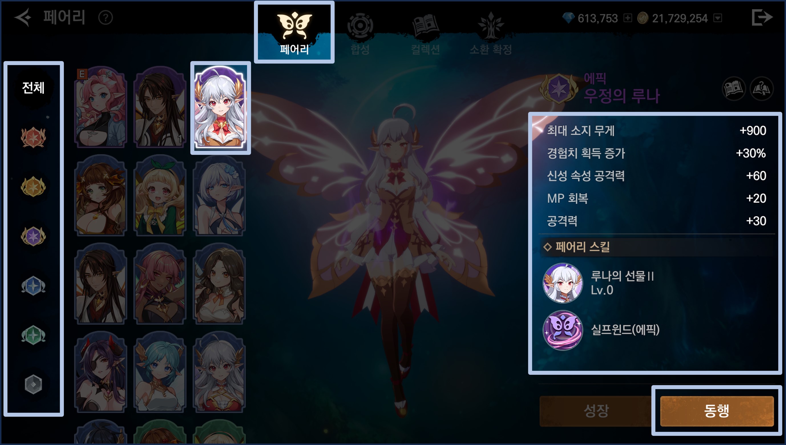 - 좌측에서 장착을 원하는 페어리을 선택한 후, '동행'을 누르면 동행이 완료됩니다.