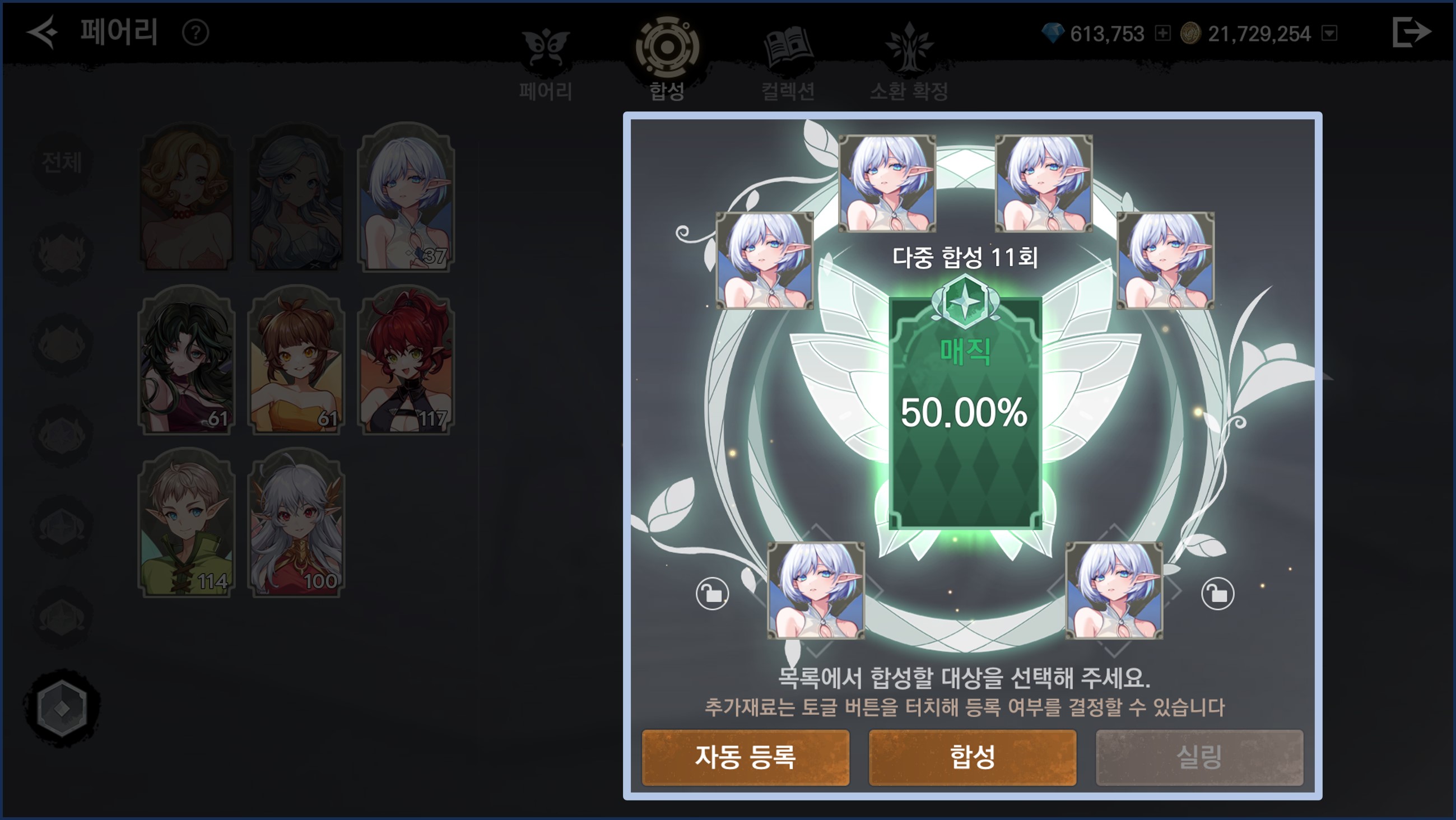 - 자동 등록 버튼을 누르면 재료 페어리이 자동으로 등록되며, 이후 합성 버튼을 누르면 페어리 합성이 진행됩니다.