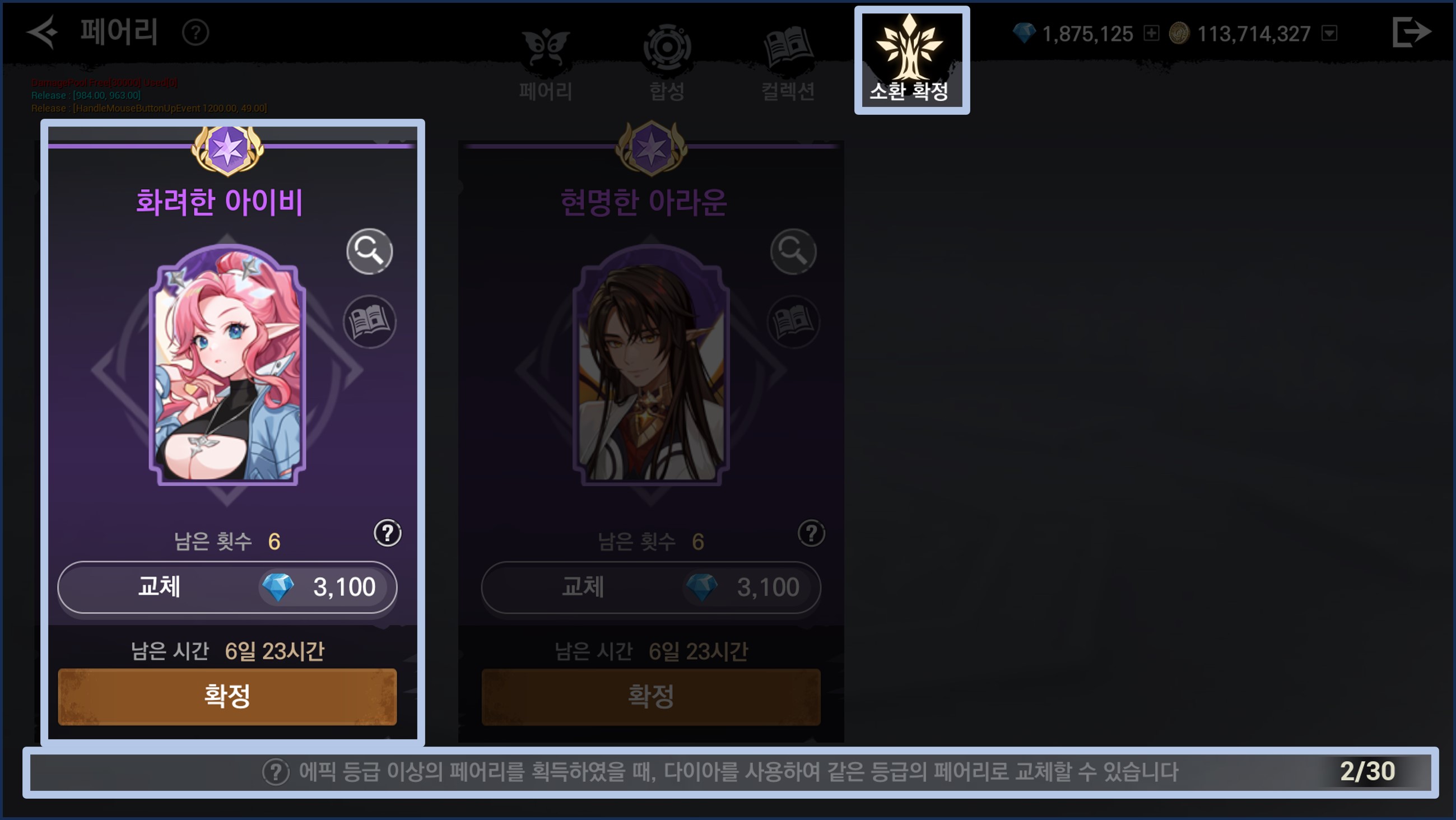 - 남은 시간 및 확정 진행 전에는 동일한 등급의 페어리으로 교체가 가능합니다.