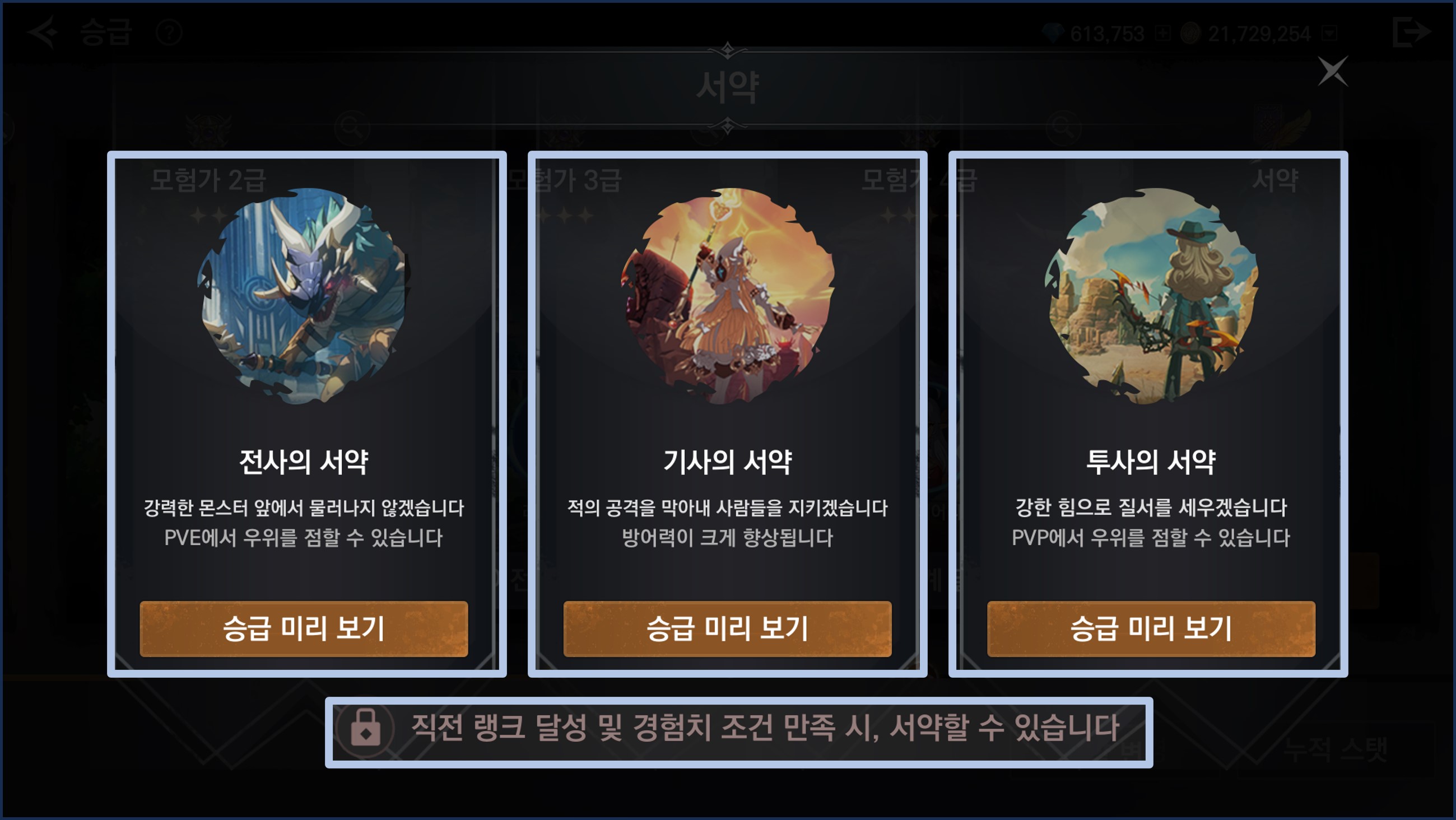 - 서약은 총 3개로 나뉘어지며, 원하는 서약을 선택하여 승급을 진행할 수 있습니다.
