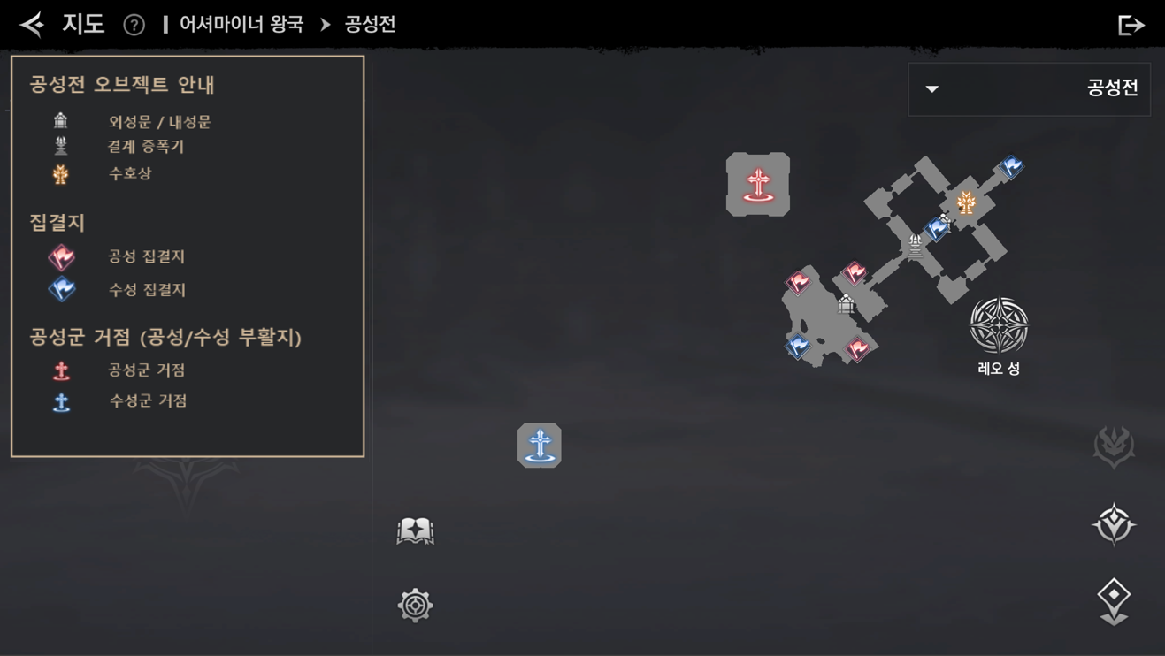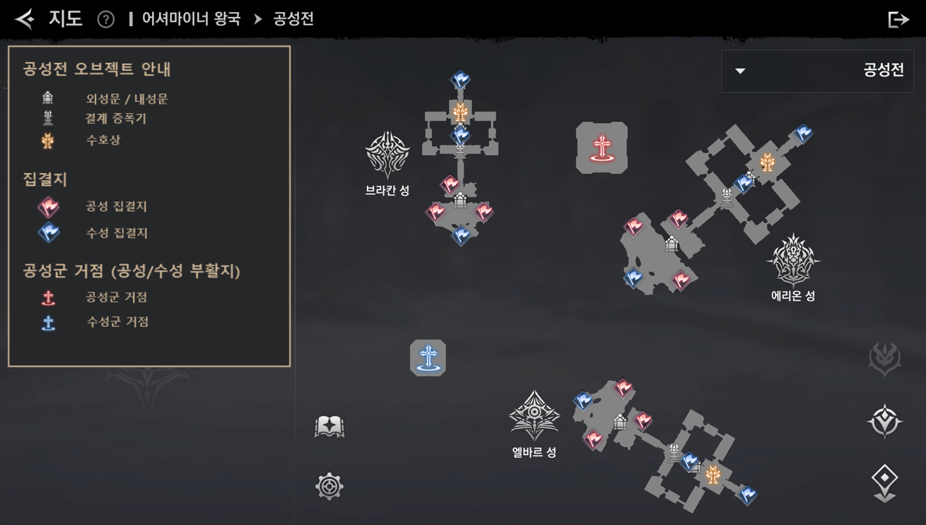 – 일반 공성전에는 1개의 성이 존재하며, 월드 공성전에는 3개의 성이 존재합니다.