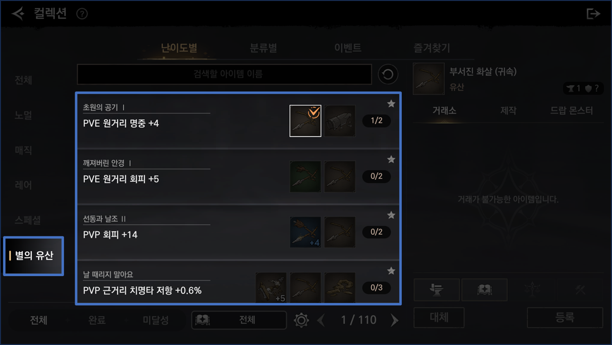 - 유산 아이템은 아이템 컬렉션 재료로 사용됩니다.