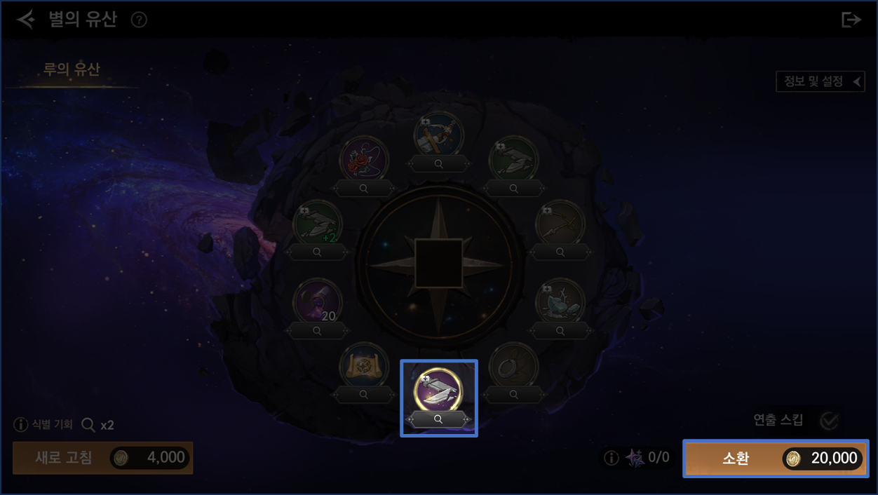 - 등장한 아이템 목록 중 원하는 아이템을 선택 후, 골드를 소비하여 유산 소환을 진행할 수 있습니다.