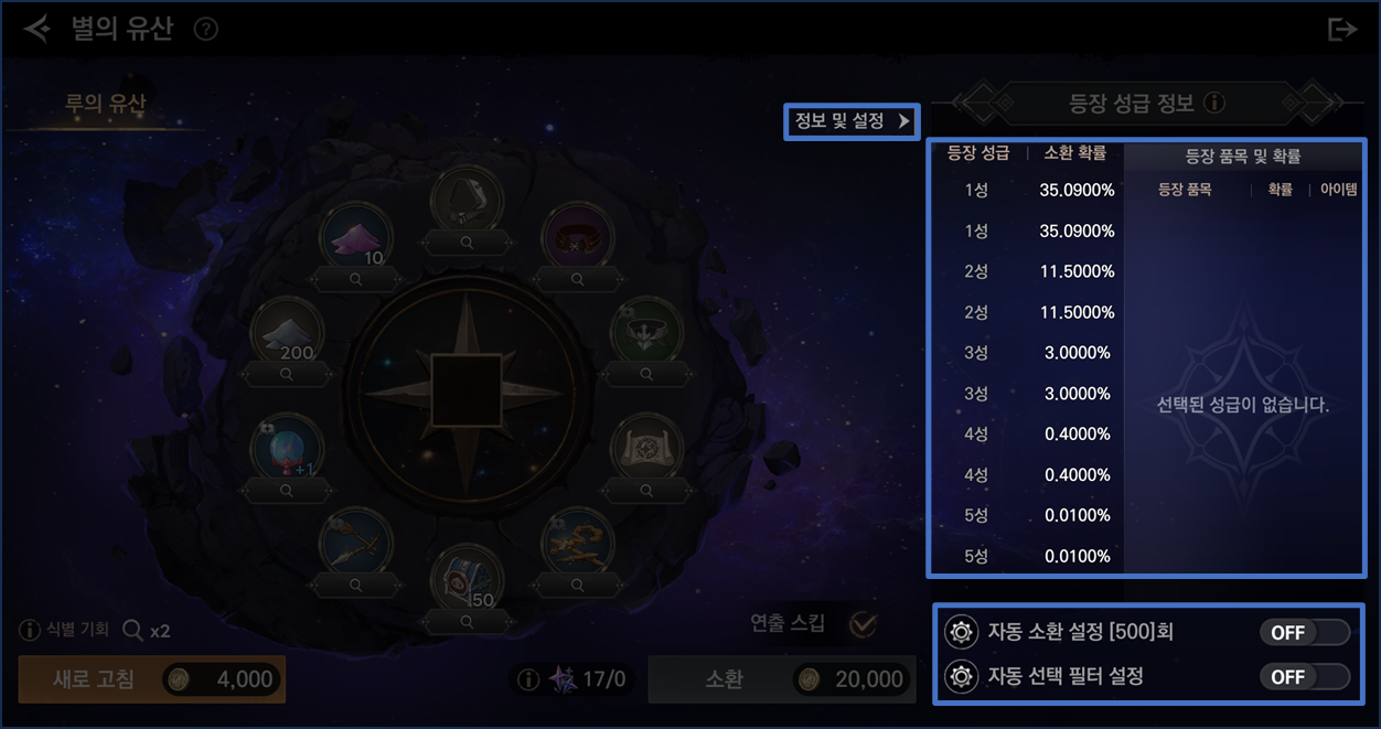 - 정보 및 설정을 통해 성급에 따른 등장 확률 확인 및 자동 소환 설정, 자동 선택 필터 설정을 진행할 수 있습니다