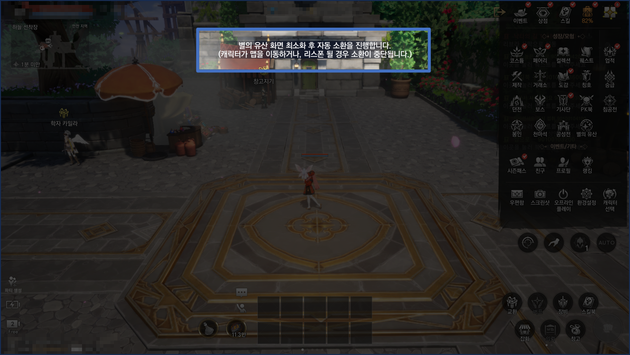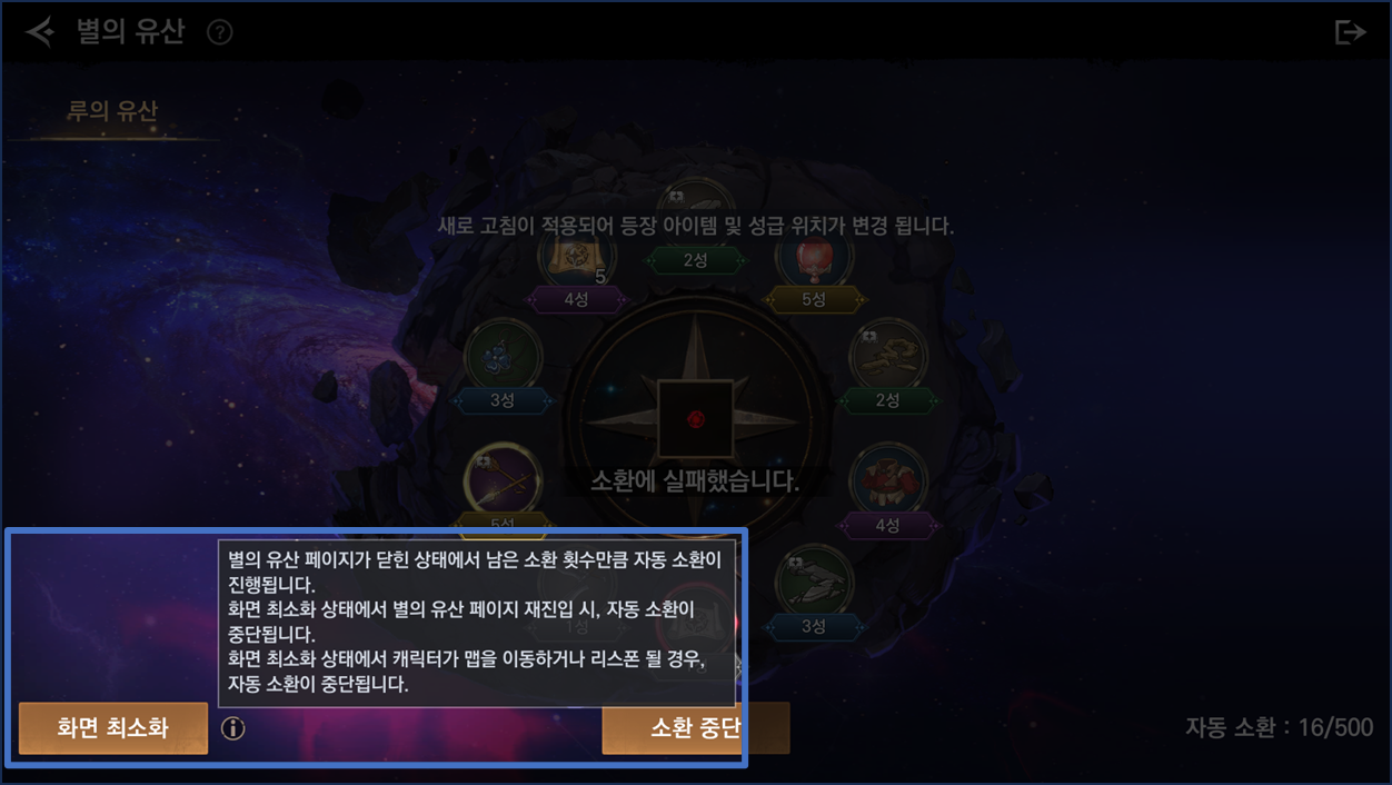 - 화면 최소화 후 자동 소환 진행 중 다시 별의 유산 페이지 진입 시 / 맵 이동 시 / 캐릭터 리스폰 시 자동 소환이 종료됩니다.