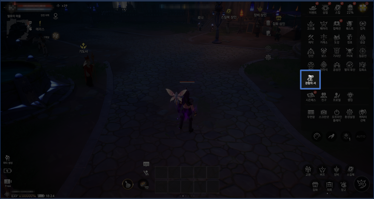 - 화면 우측 상단의 메뉴 - '경험의 서'를 차례대로 눌러주세요.