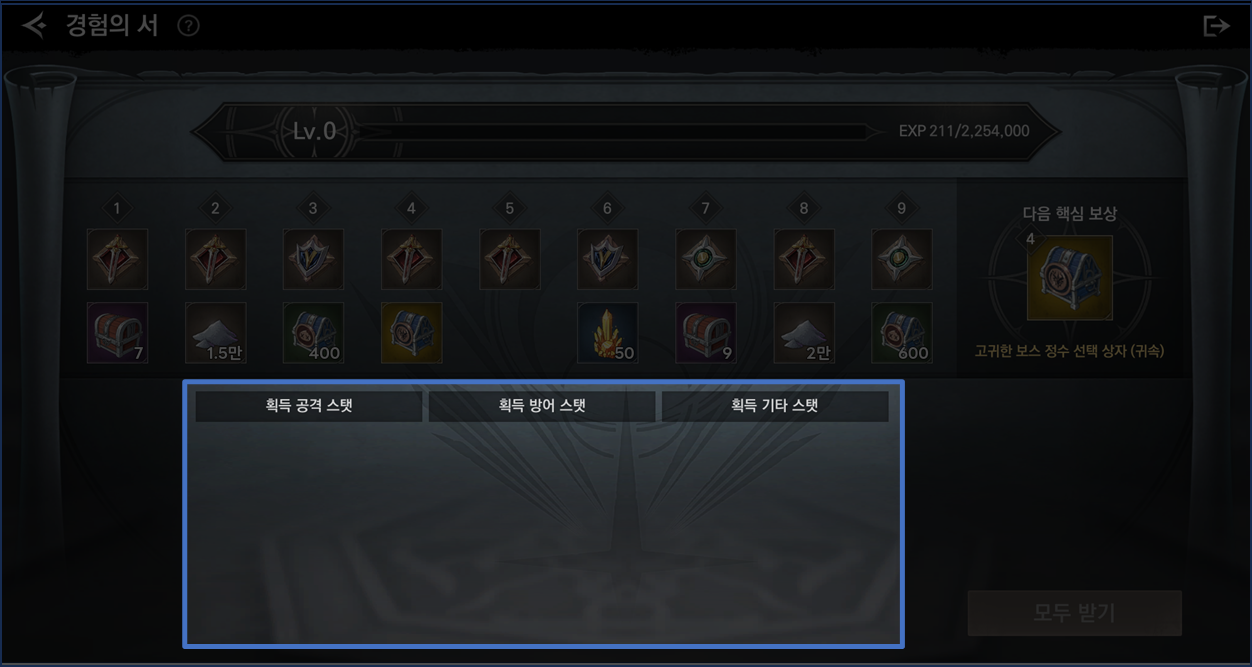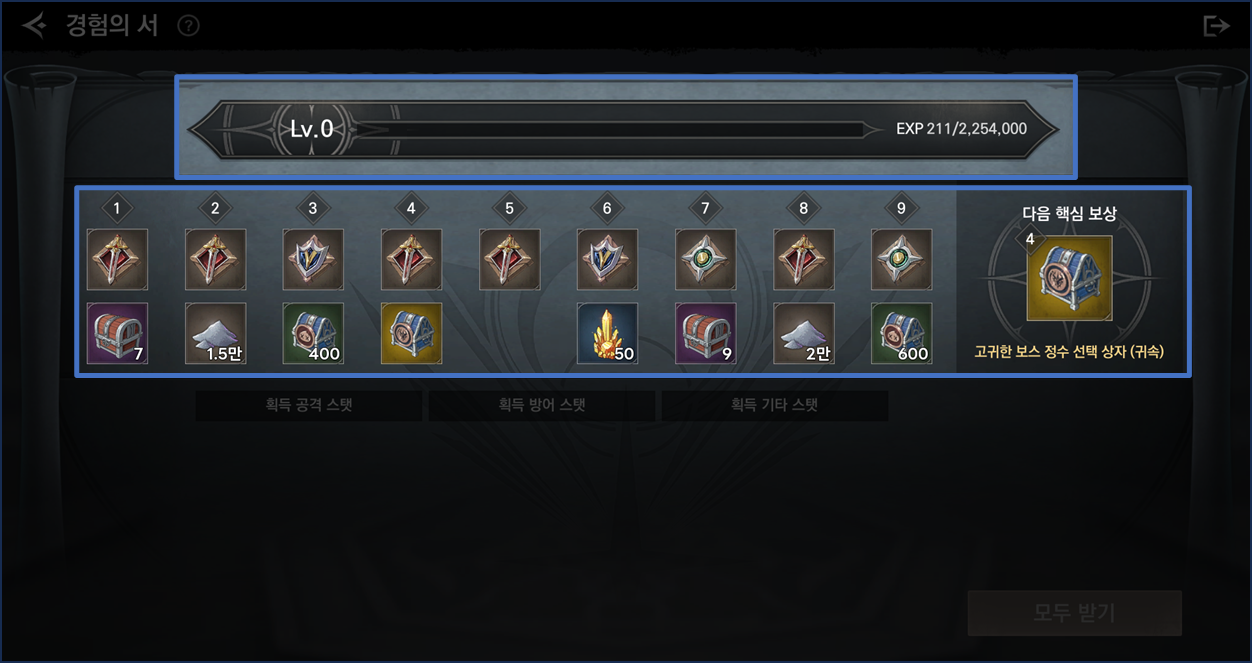 - 경험의 서 레벨 달성에 따라 스탯과 레벨 별 보상, 레전드 등급 장비 아이템 제작 재료 등을 획득할 수 있습니다.