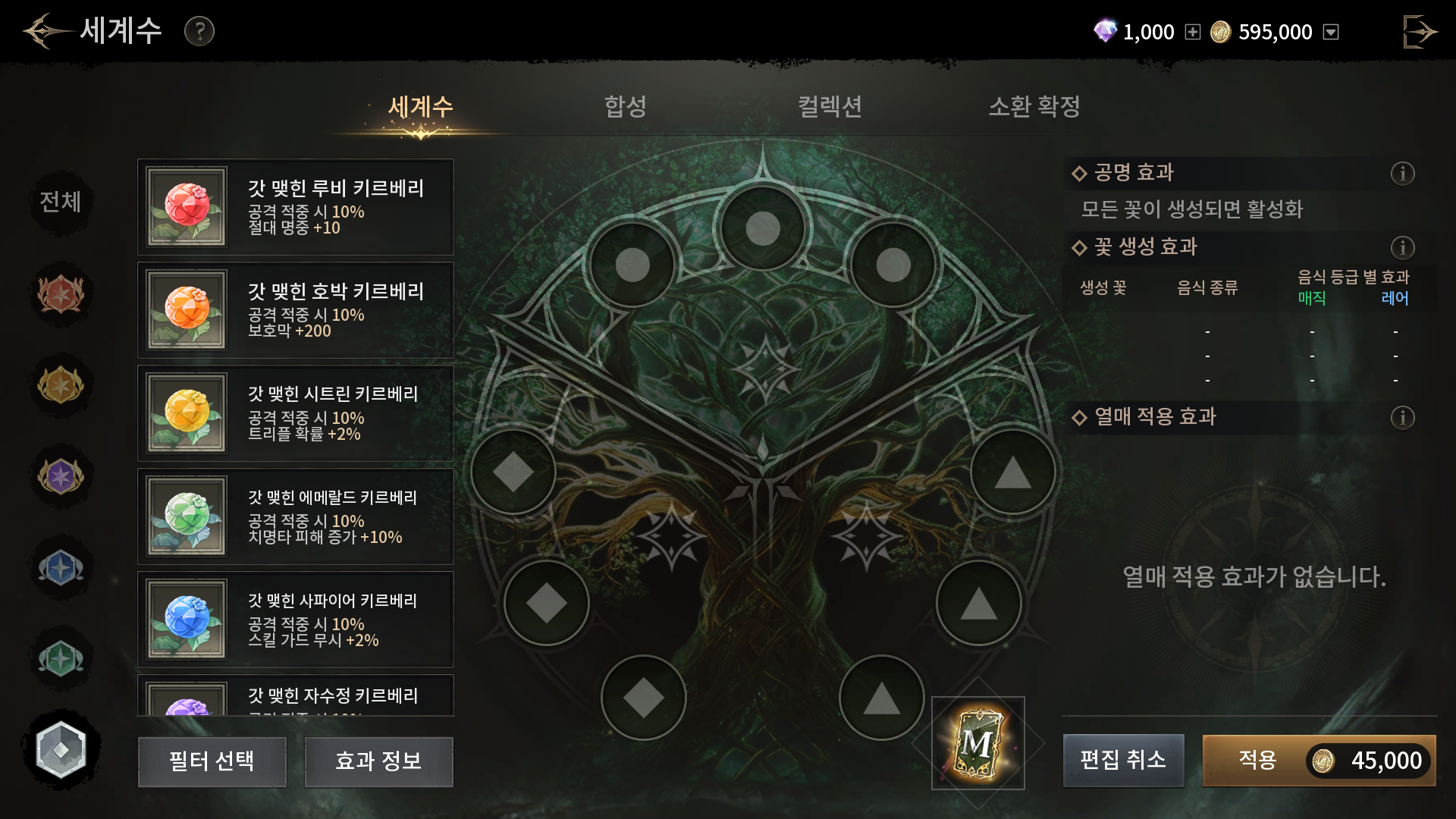 - '세계수'는 '세계수의 열매'를 수집하고 조합하여 강력한 시너지를 만들어내는 특별한 성장 시스템입니다.