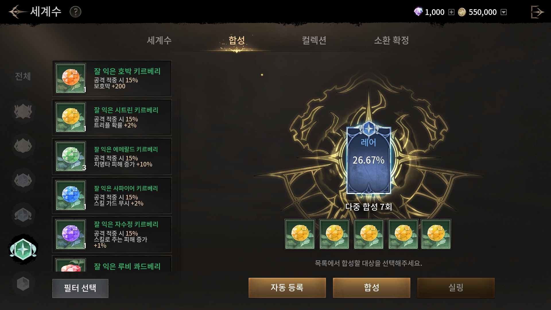 - 자동 등록 버튼을 누르면 재료 열매가 자동으로 등록되며, 이후 합성 버튼을 누르면 합성이 진행됩니다.
