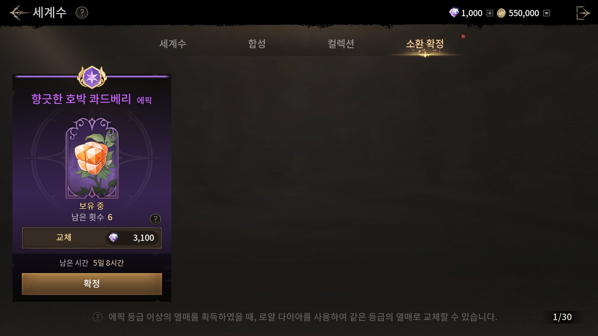 - 보유한 세계수 열매 실링 조각을 모아 확정으로 동일 등급 세계수 열매를 획득할 수 있습니다.