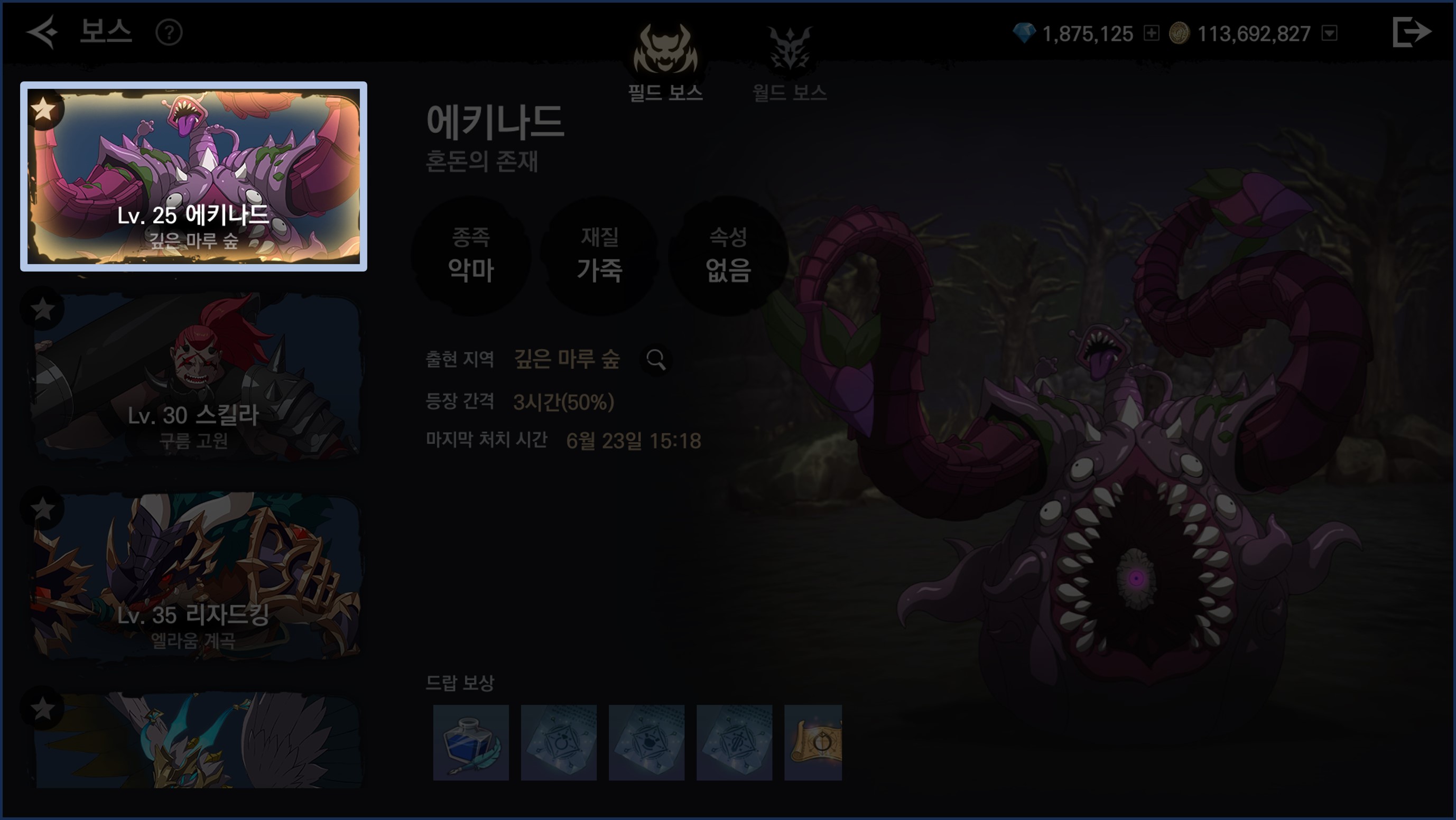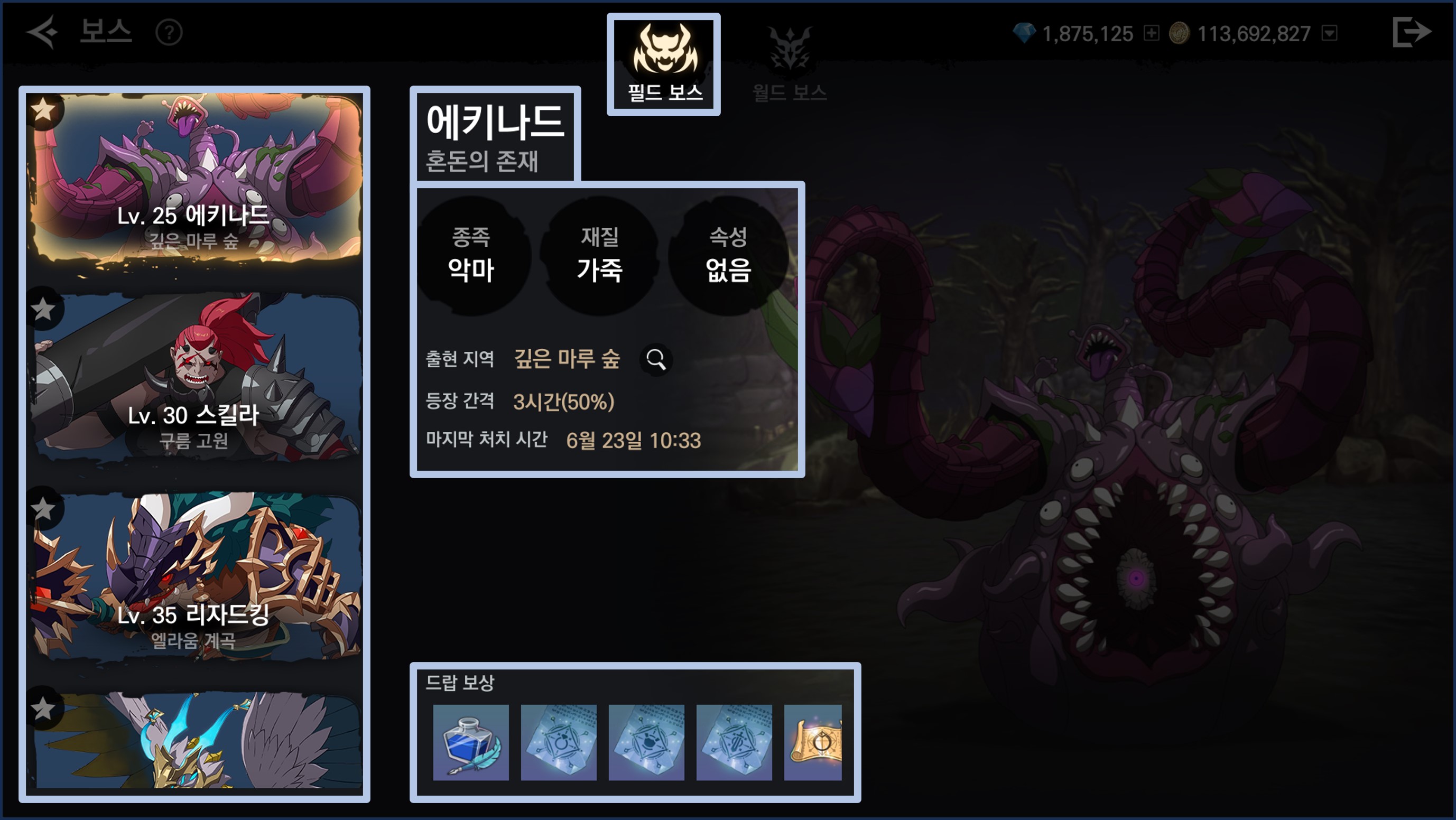 - 출현 지역을 확인할 수 있고 해당 보스의 등장 간격과 주요 획득 보상 등을 확인할 수 있습니다.