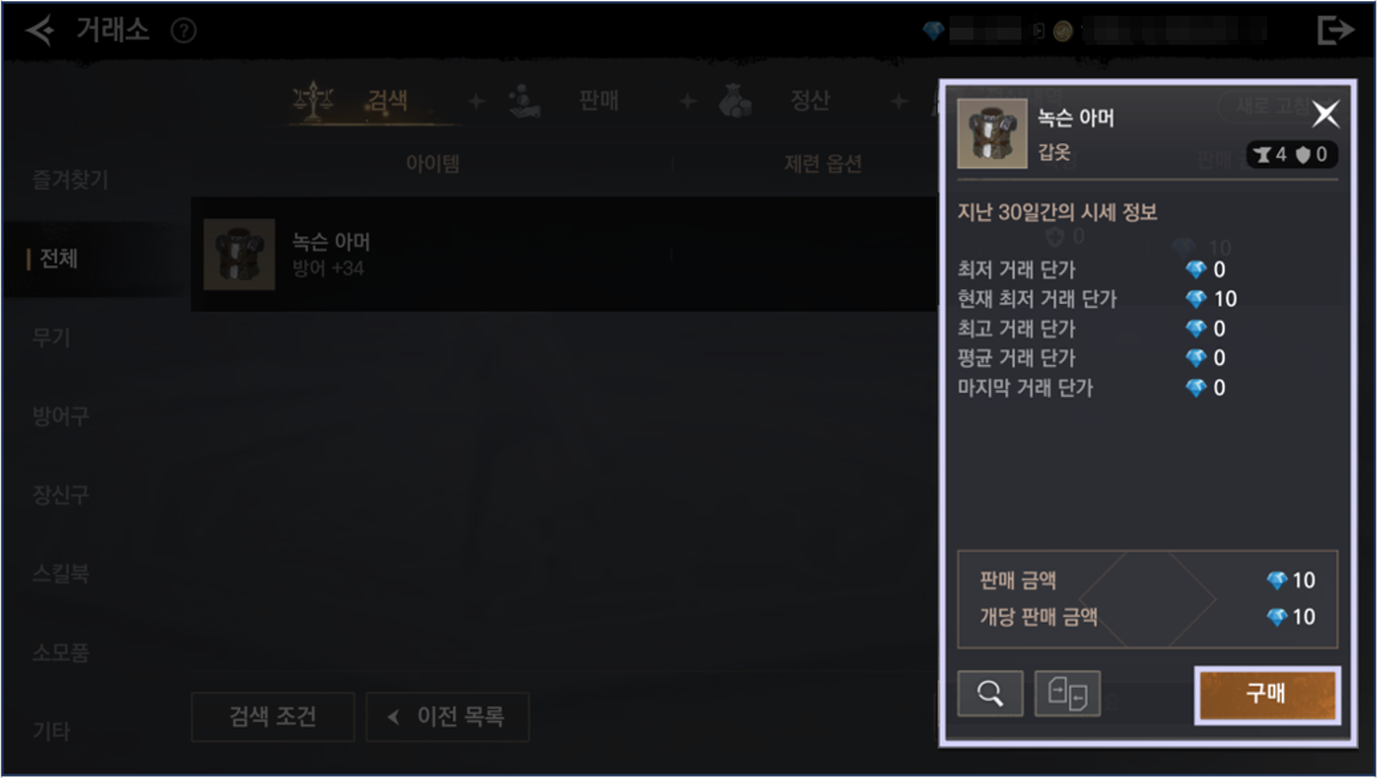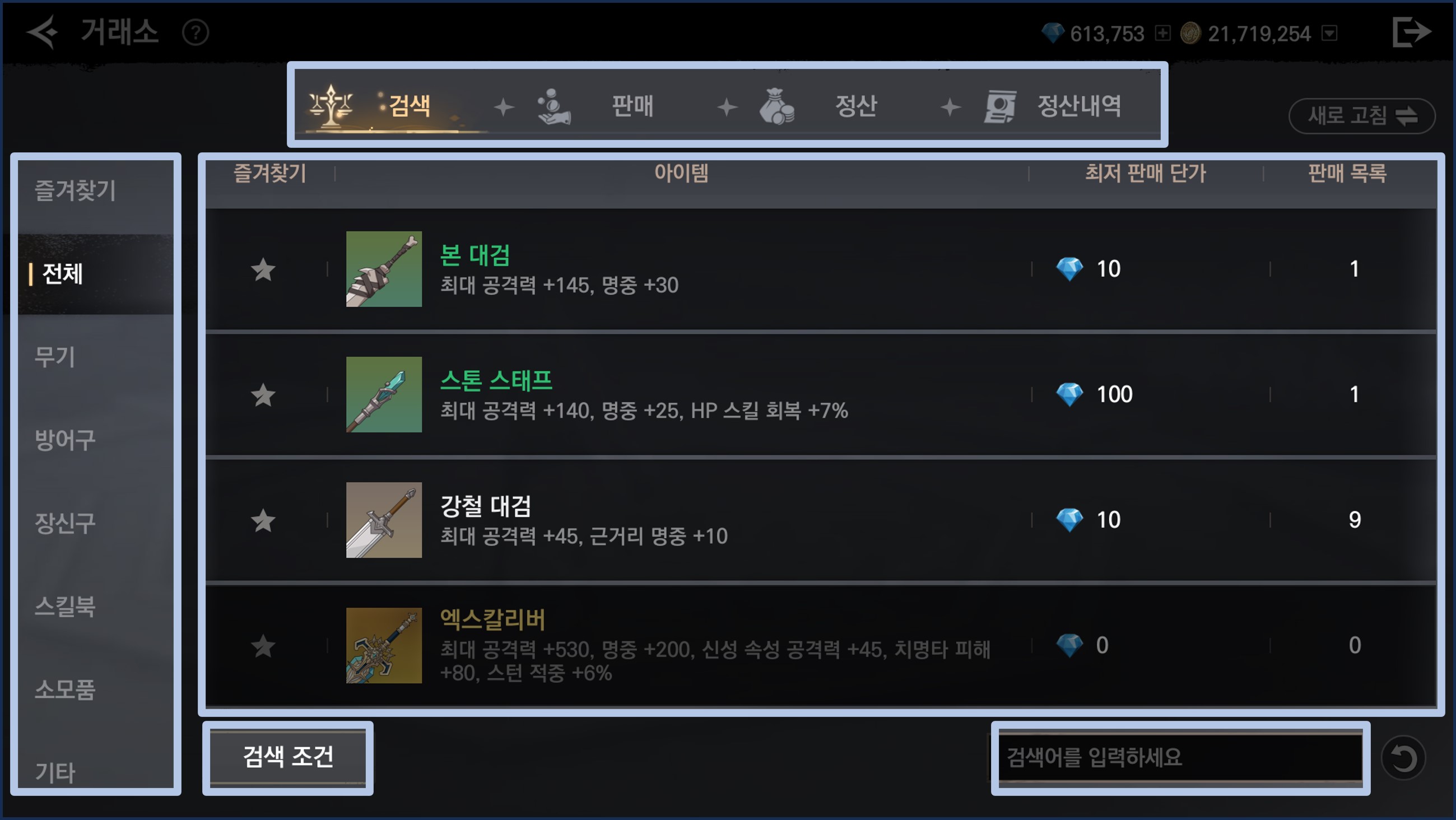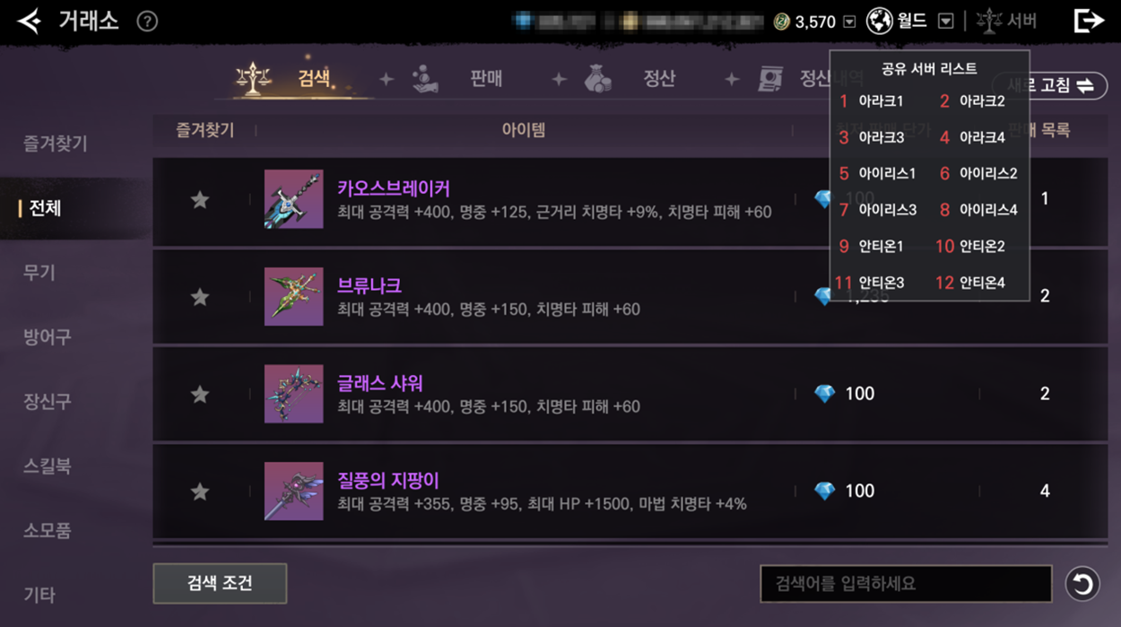 - 아이템을 구매하거나 시세 등을 확인하기 위해서 거래소에 등록된 모든 아이템을 검색 탭을 통해 확인할 수 있습니다