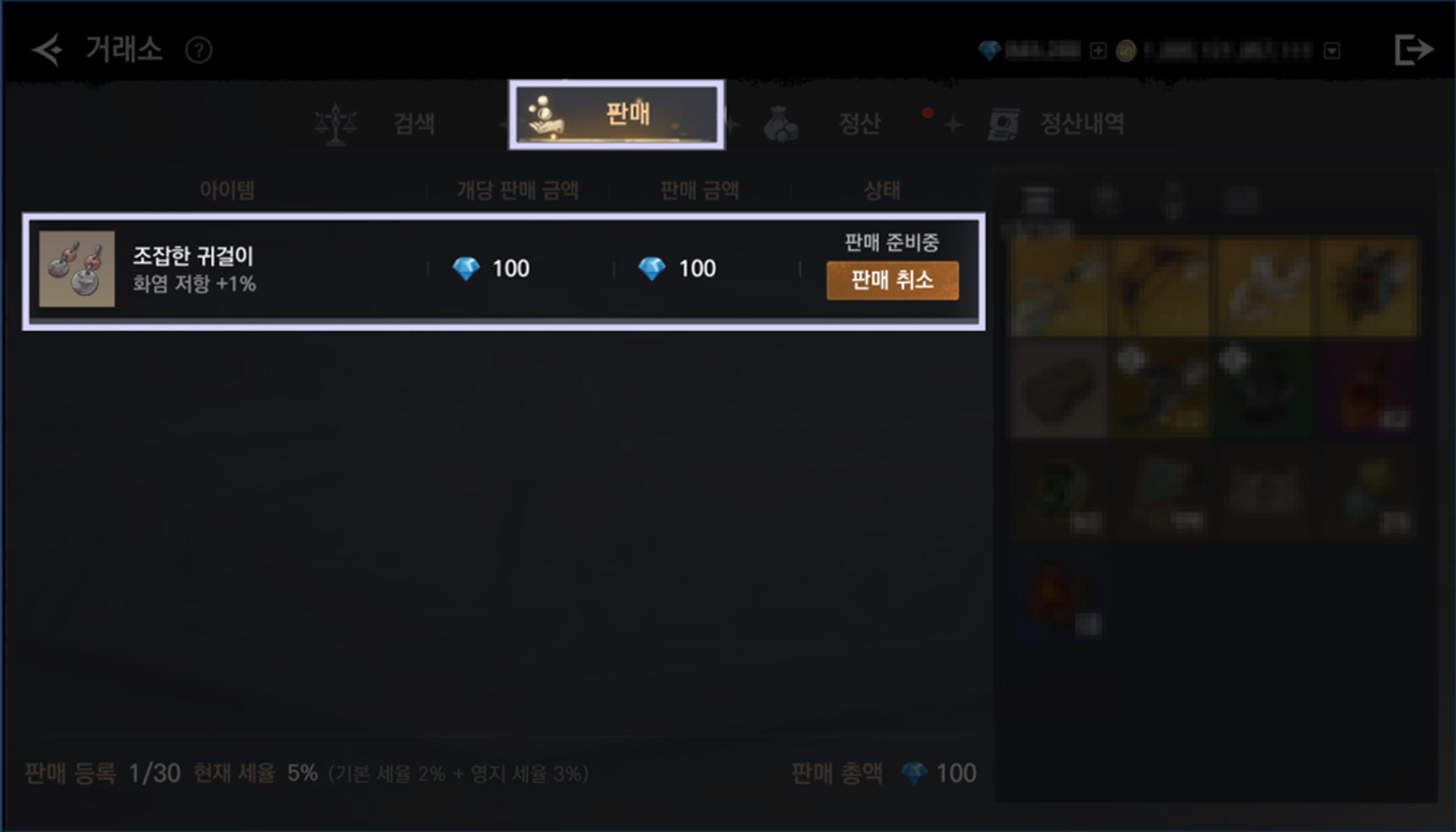- 판매 등록 탭에서 자신이 보유한 거래 가능한 아이템을 다른 플레이어와 자유롭게 거래할 수 있습니다