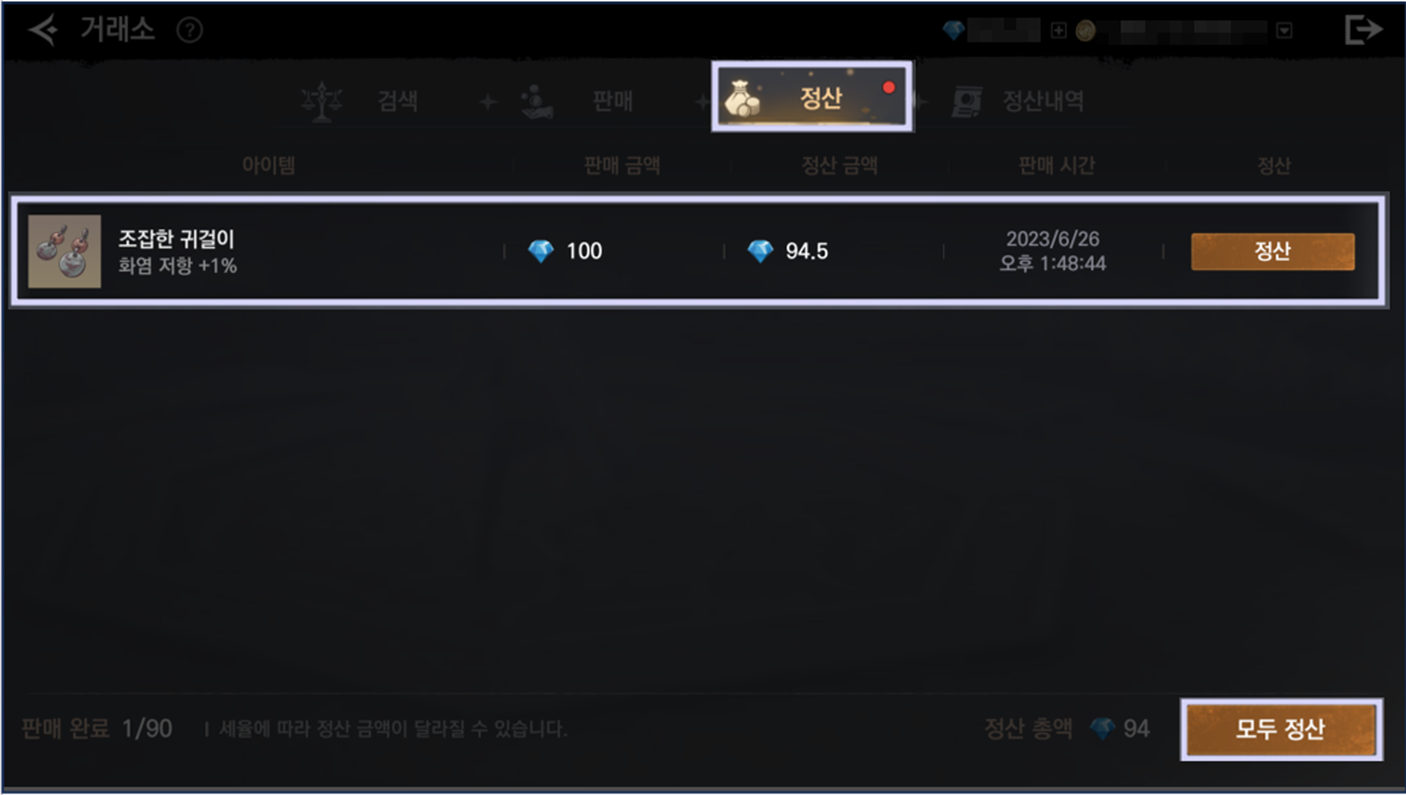 - 아이템이 판매 완료되면 거래 수수료를 제외한 금액을 정산 받을 수 있습니다.
