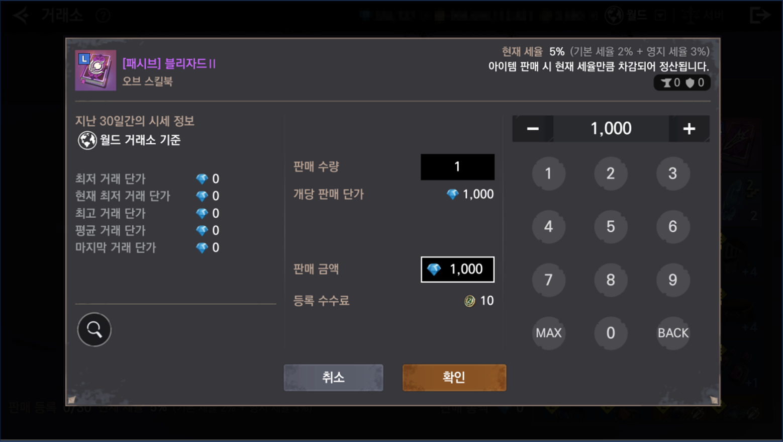 - 등록 수수료는 골드로만 지불되며 판매 금액 1다이아 당 100골드가 소모됩니다.