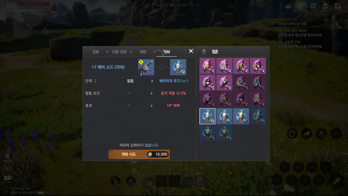 - 개화는 레어 등급 이상의 '갑옷/무기' 아이템에 진행할 수 있습니다.