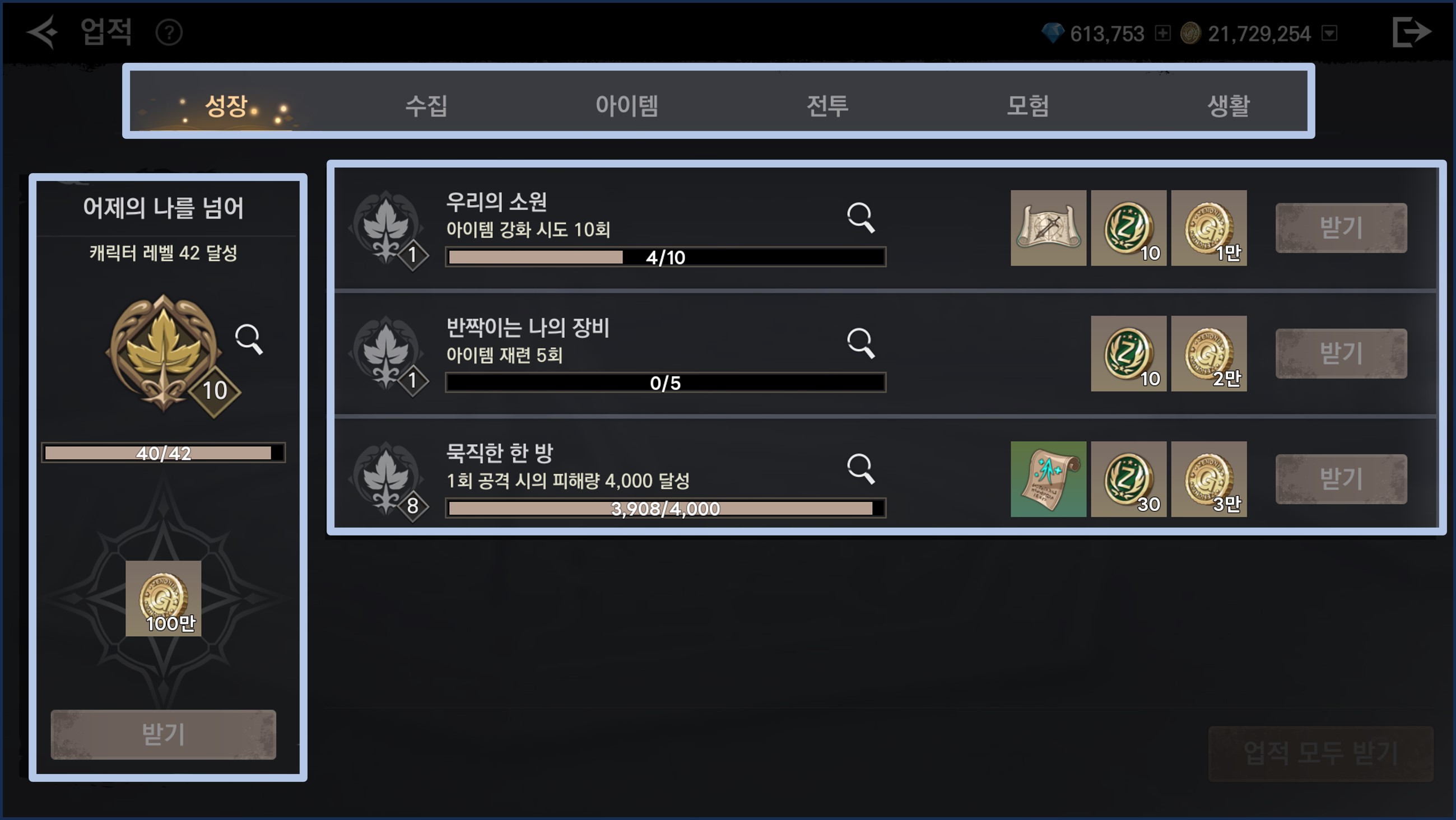 - 업적 모두 받기를 누르면 완료된 업적의 모든 보상을 한번에 받을 수 있습니다.