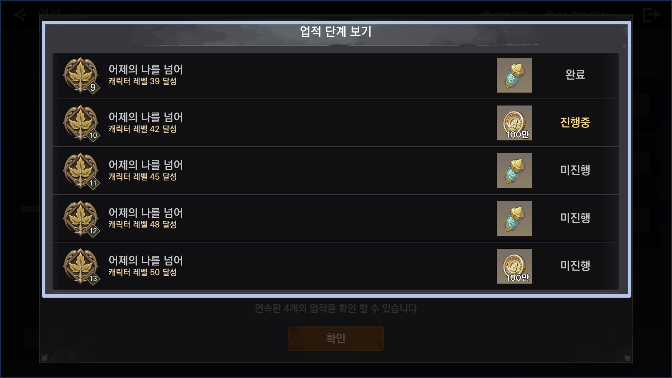 - 돋보기 모양을 누르면, 해당 업적의 단계와 보상을 확인할 수 있습니다.