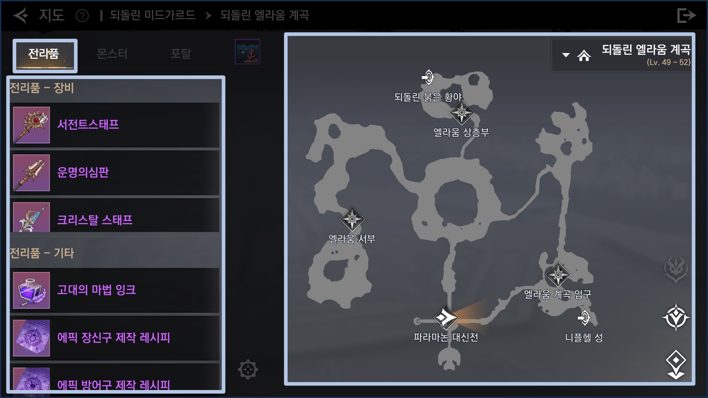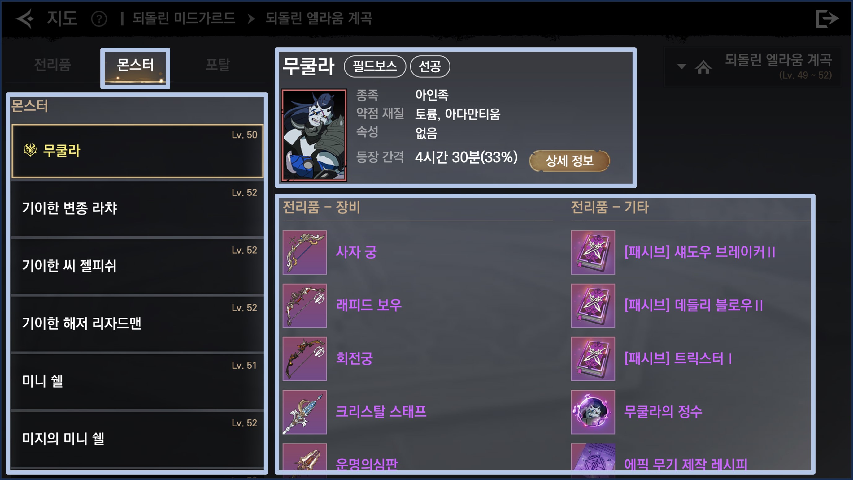 - 해당 지역의 전리품을 확인할 수 있습니다.