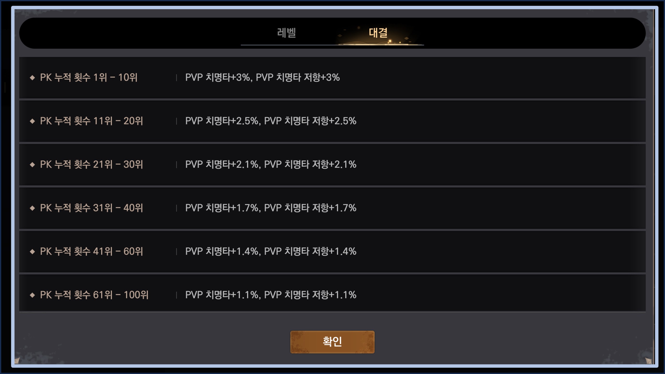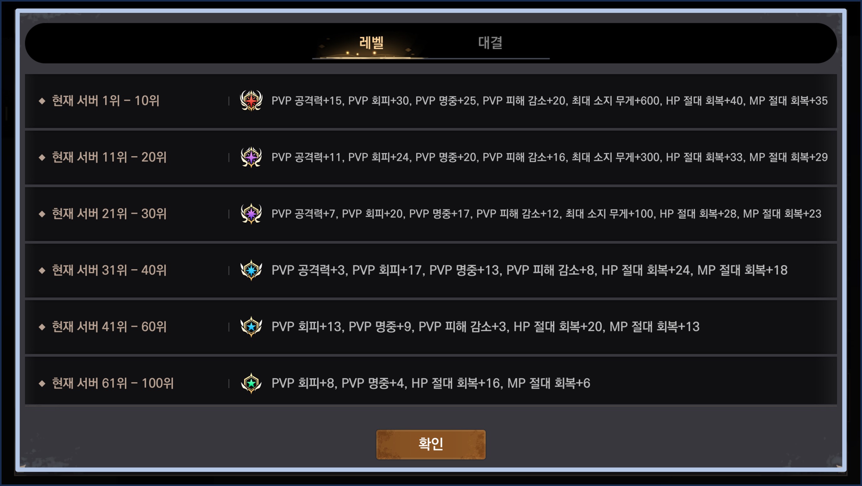 - - 랭킹 혜택은 레벨과 대결로 구분됩니다.