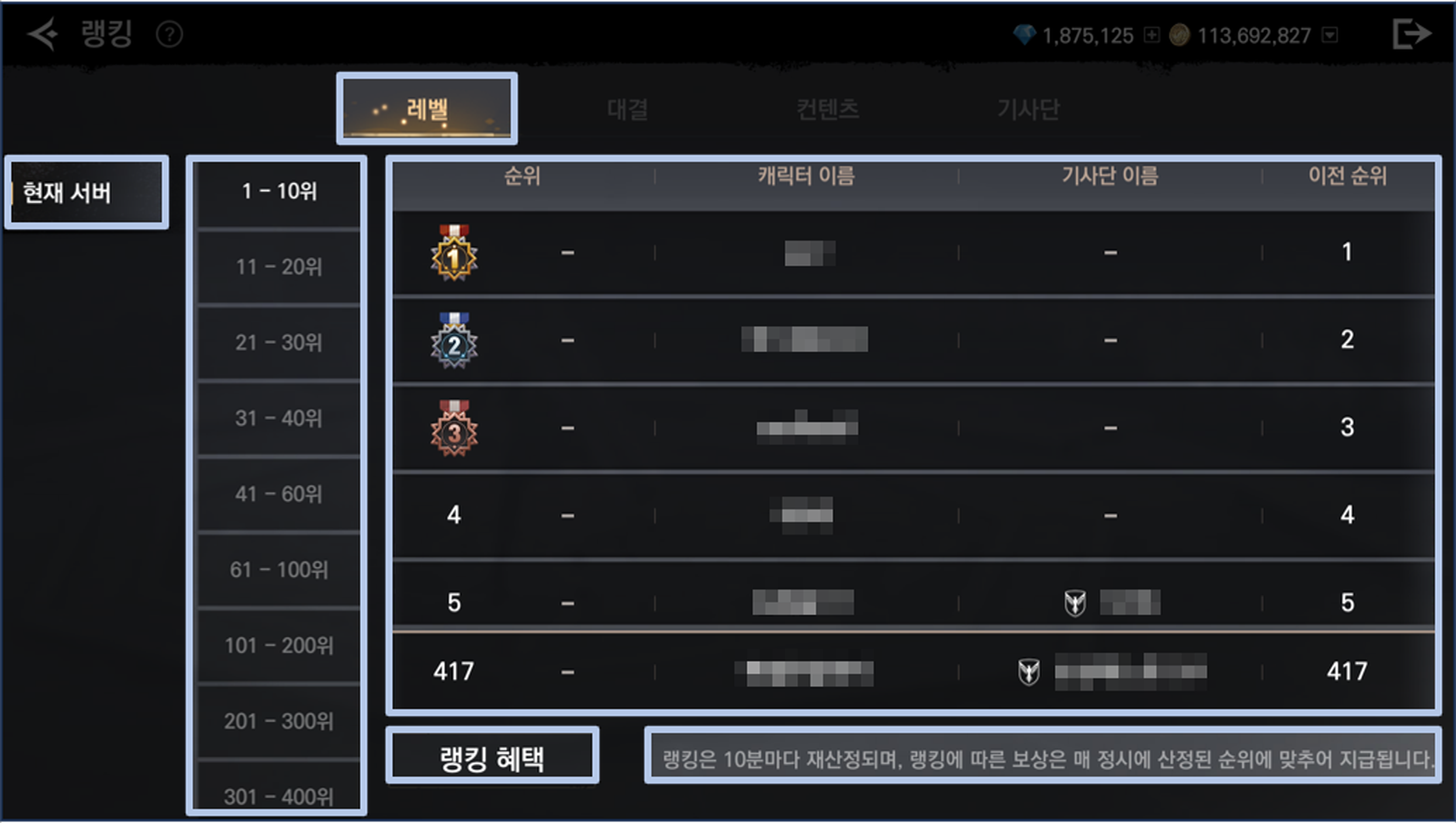 - 레벨: 레벨은 내 서버에 소속된 플레이어 레벨, 경험치에 따라 순위가 산정됩니다.