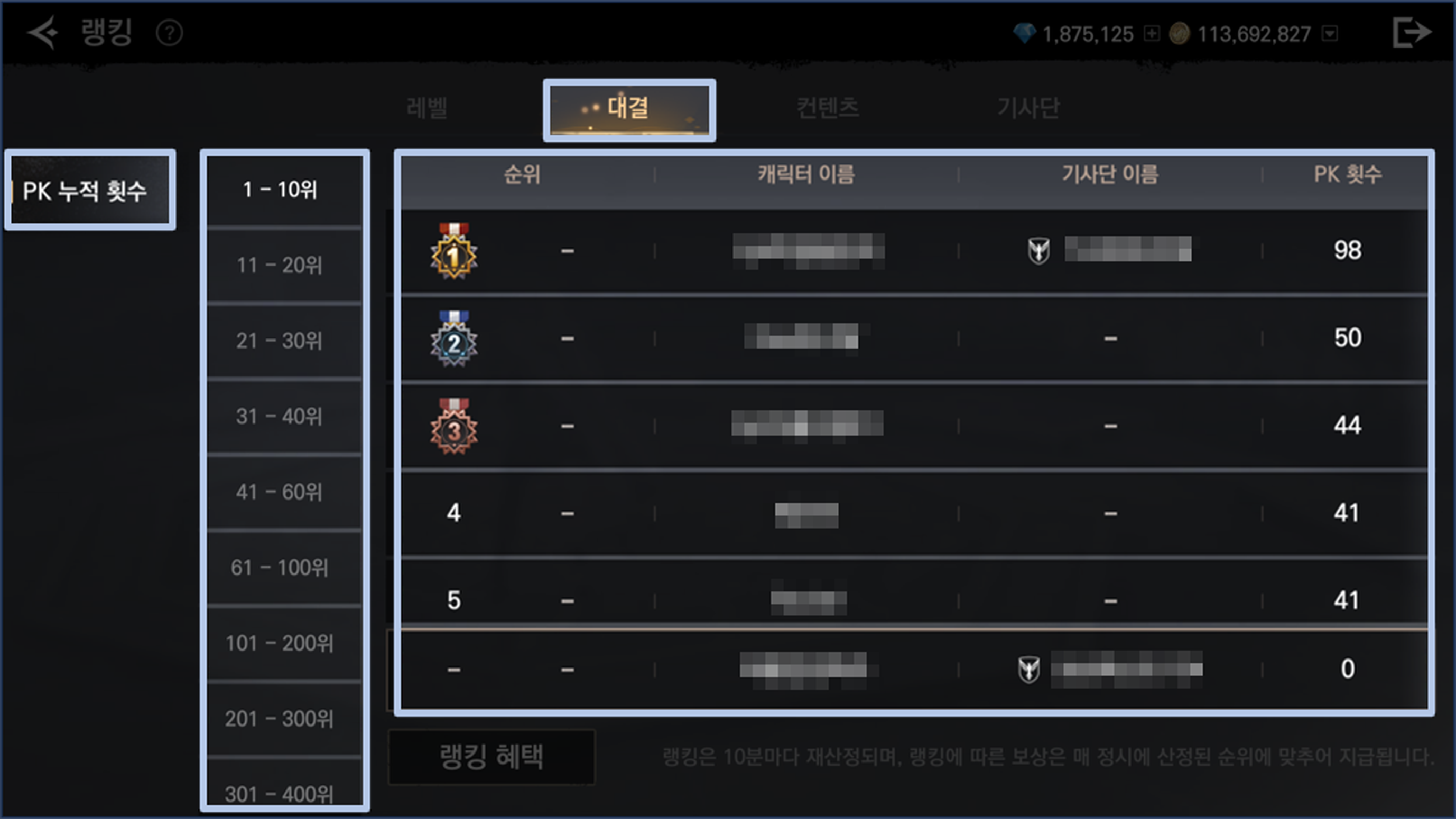 - 대결: 대결 랭킹은 PK횟수에 따라 순위가 산정되며, 동일한 경우 먼저 달성한 순서대로 높은 순위로 산정됩니다.