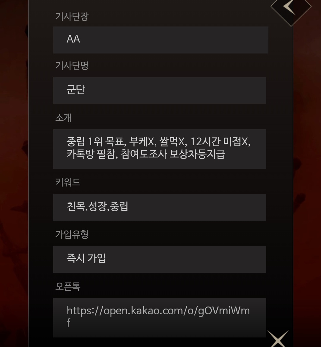 자유게시판 공략 게시판 기사단 홍보 이미지게시판 월드 게시판 건의 및 제보 라그릿2 ■군단■ 기사단원 모집 AA 2023-05-29 14:31 0 65 0 안녕하세요~ 라그릿2 "군단" 기사단에서컨텐츠 즐기면서 열정적으로 꾸준히 플레이 하실분들 모집합니다!! 0 0 댓글 0 더보기 목록 이전 서버 : 안티온4 "과일"기사단 접속률 좋고 즐겜 하실 분들 가입하세요~ 다음 프레이4 “천사” 기사단에서 함께 하실분들 모십니다