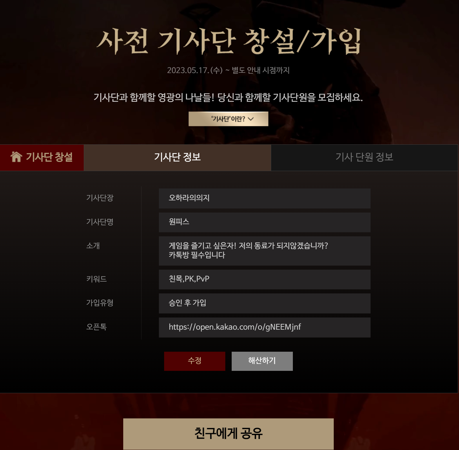 자유게시판 공략 게시판 기사단 홍보 이미지게시판 월드 게시판 건의 및 제보 카엘 2서버 원피스 기사단 현재 8명 오픈챗 필수~!! 오하라의의지 2023-06-03 23:05 0 54 0 저와 동료가 될 자!! 0 0 댓글 0 더보기 목록 이전 카엘2 서버에서 [서울시] 기사단원 모집합니다 ! 오픈 챗방 ! 다음 ⭐죠스타⭐ 기사단원 모집 (아르카스2) (5/30)
