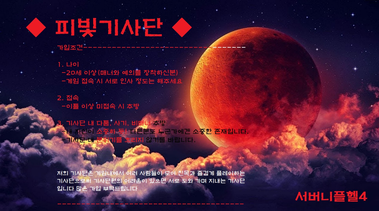 자유게시판 공략 게시판 기사단 홍보 이미지게시판 월드 게시판 건의 및 제보 =========(피빛기사단/니플헬4서버)========기사단원 모집 中 이슬 2023-06-05 21:00 0 57 0 이벤트! 0 0 댓글 0 더보기 목록 이전 기사단원 모집합니다~~ 다음 카엘4 신화기사단