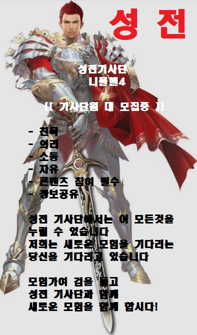 자유게시판 공략 게시판 기사단 홍보 이미지게시판 월드 게시판 건의 및 제보 [모여라] ll 성전기사단에서 새로운 모험가님을 기다리고 있습니다 ll Tetrapediini8895 2023-06-14 13:31 0 62 0 기사단 가입하고 코스튬 쿠폰도 받아가세요~ 0 0 댓글 0 더보기 목록 이전 니플헬1 [JUSTICE] 즉시가입 모집 다음 카엘 1서버 잡초 기사단 모집합니다