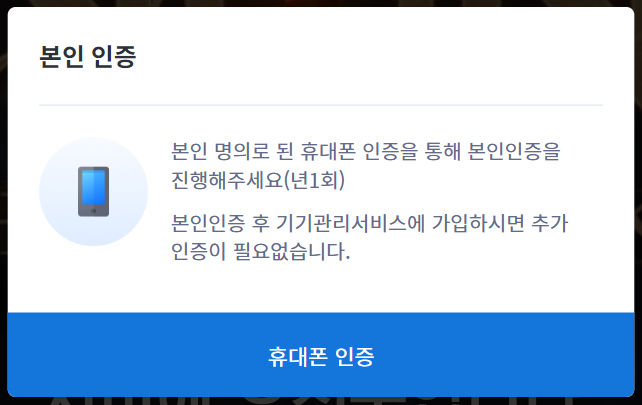 2. 기기 관리 서비스 최초 이용 시 본인 명의 휴대폰 번호로 인증이 필요 하며 연령 확인을 위한 본인 인증 진행을 완료 하신 경우 추가 인증 없이 서비스를 바로 이용하실 수 있습니다.
