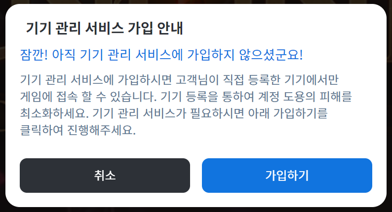 PC방처럼 다수가 이용하는 공용PC나 본인이 자주 이용하지 않는 기기에서 등록하여 게임을 이용하신 경우 꼭 기기 등록 삭제를 부탁 드립니다.