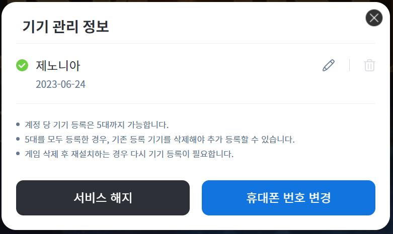 기기 관리 서비스 가입시 등록된 기기에서만 제노니아에 접속하실 수 있으므로 안전한 게임 이용을 위해 서비스 이용을 권장드립니다.