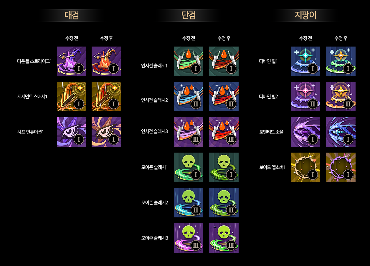 - 대검, 단검, 지팡이 스킬의 아이콘으로 스킬 단계를 쉽게 확인할 수 있도록 스킬 단계 별 아이콘이 변경됩니다.